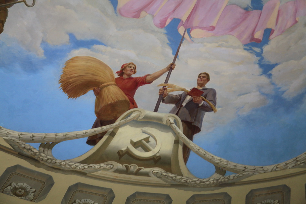 На фреске — труженики села и города: советские люди, приближающие светлое коммунистическое будущее. Несколько лет назад изображение отреставрировали.