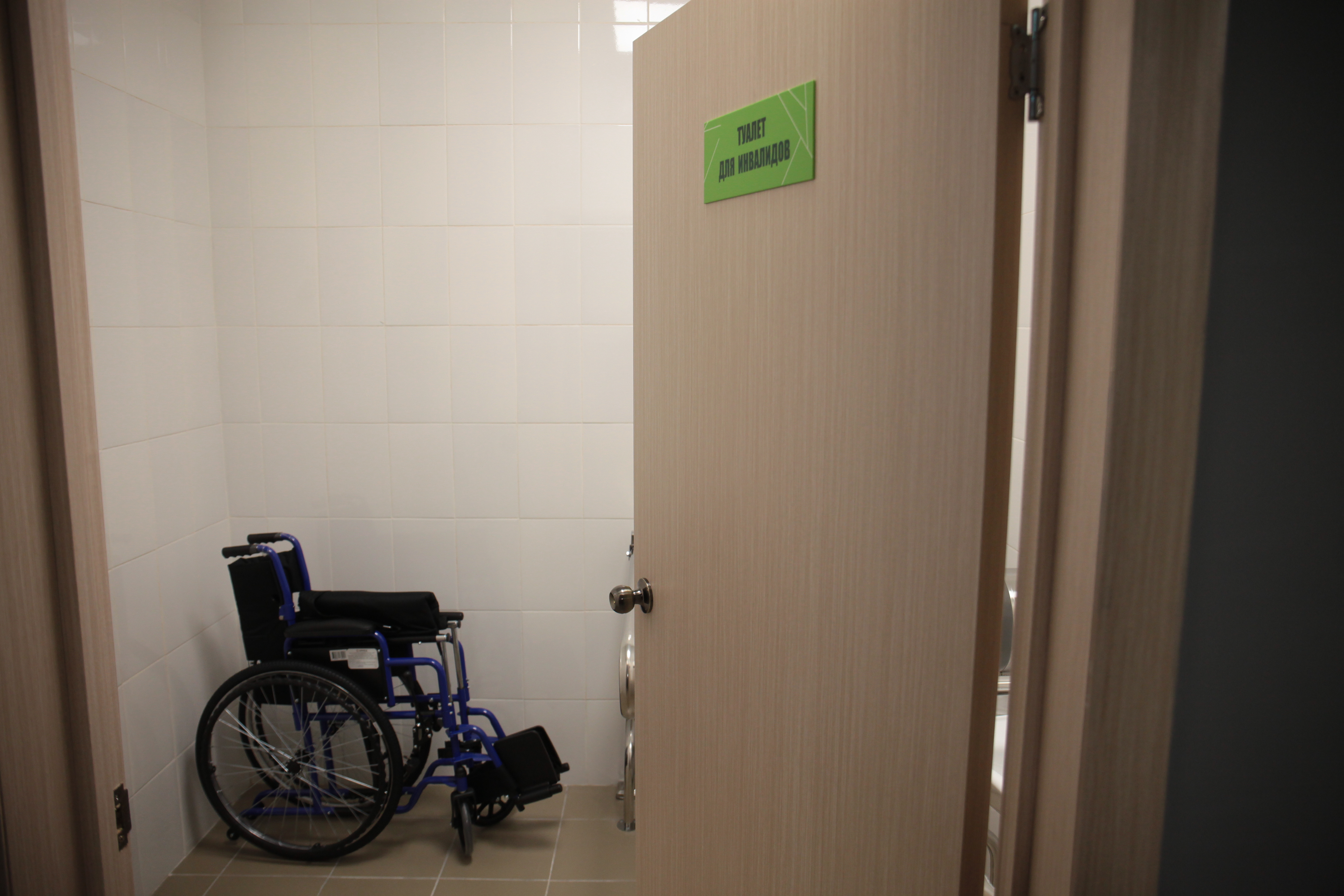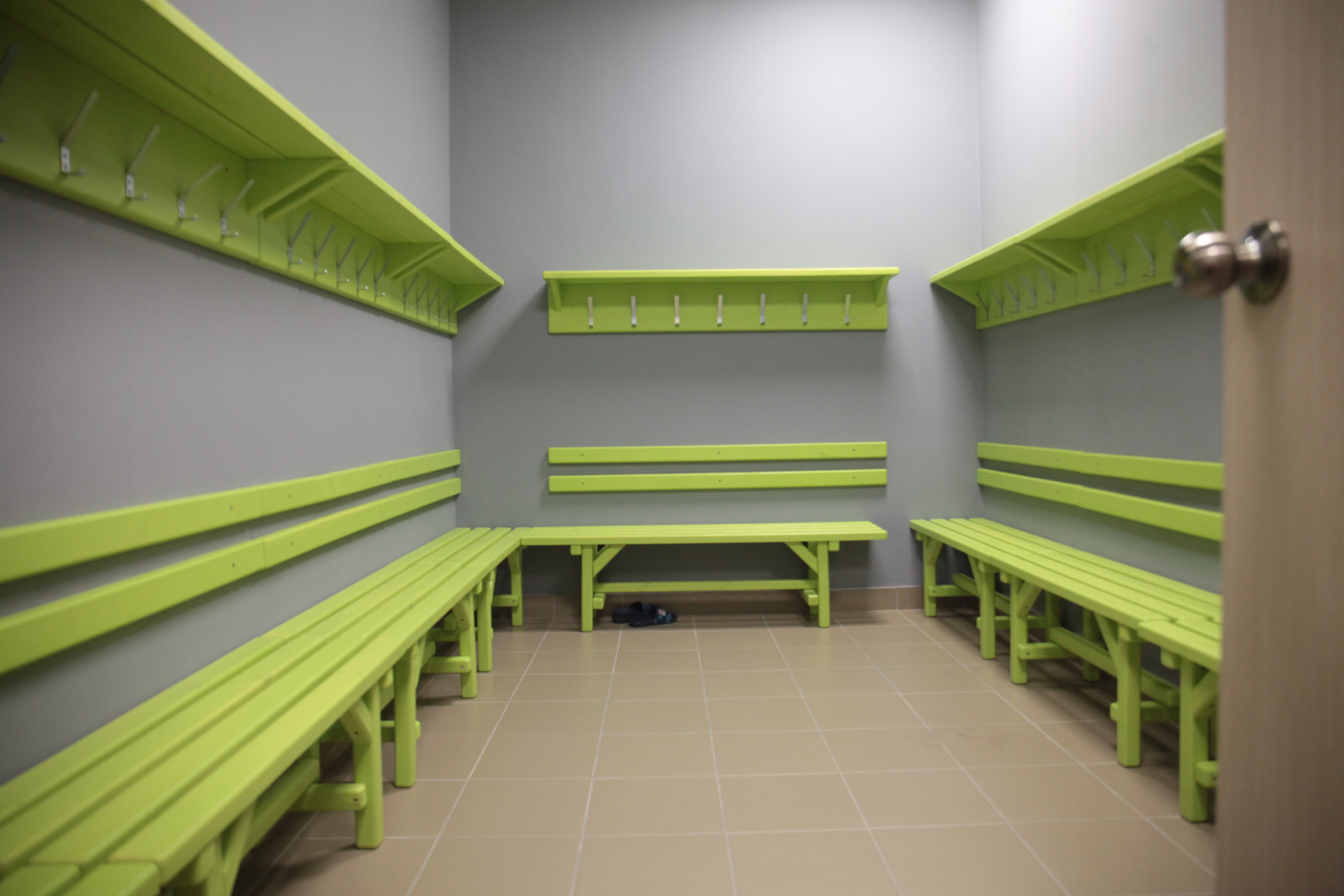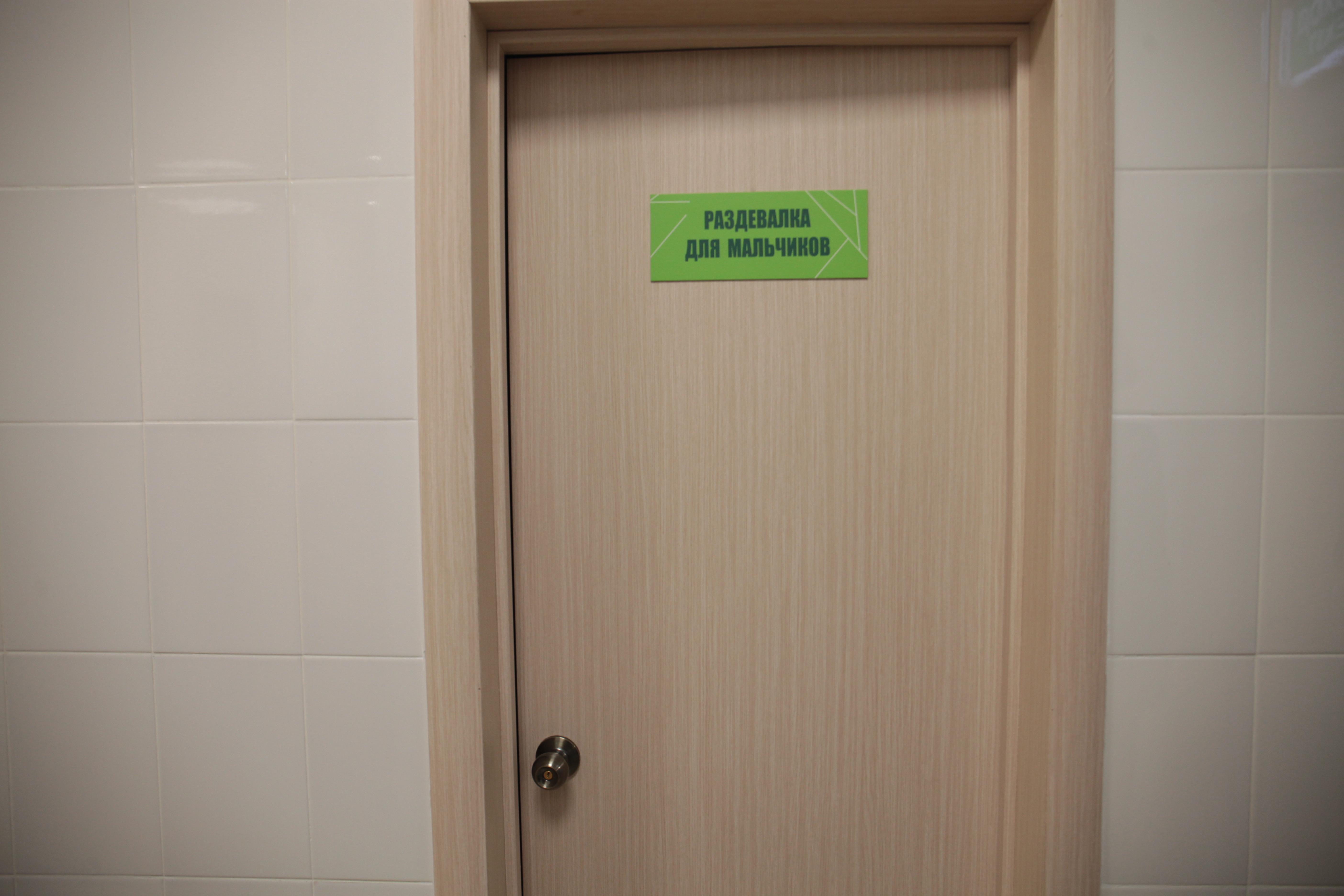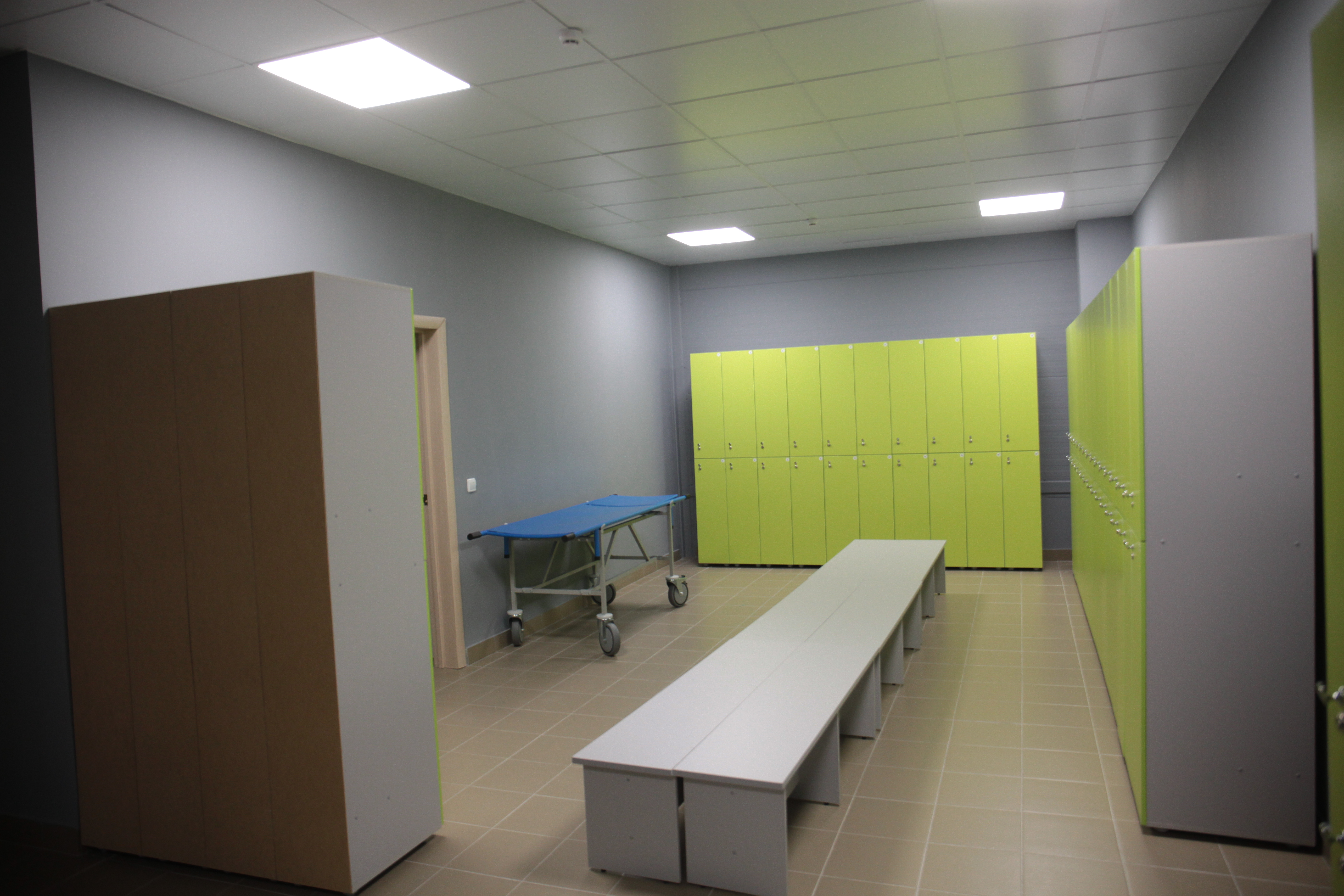 В здании обустроили просторные раздевалки, душевые и туалеты, для детей с ОВЗ — специальные уборные и пандусы.