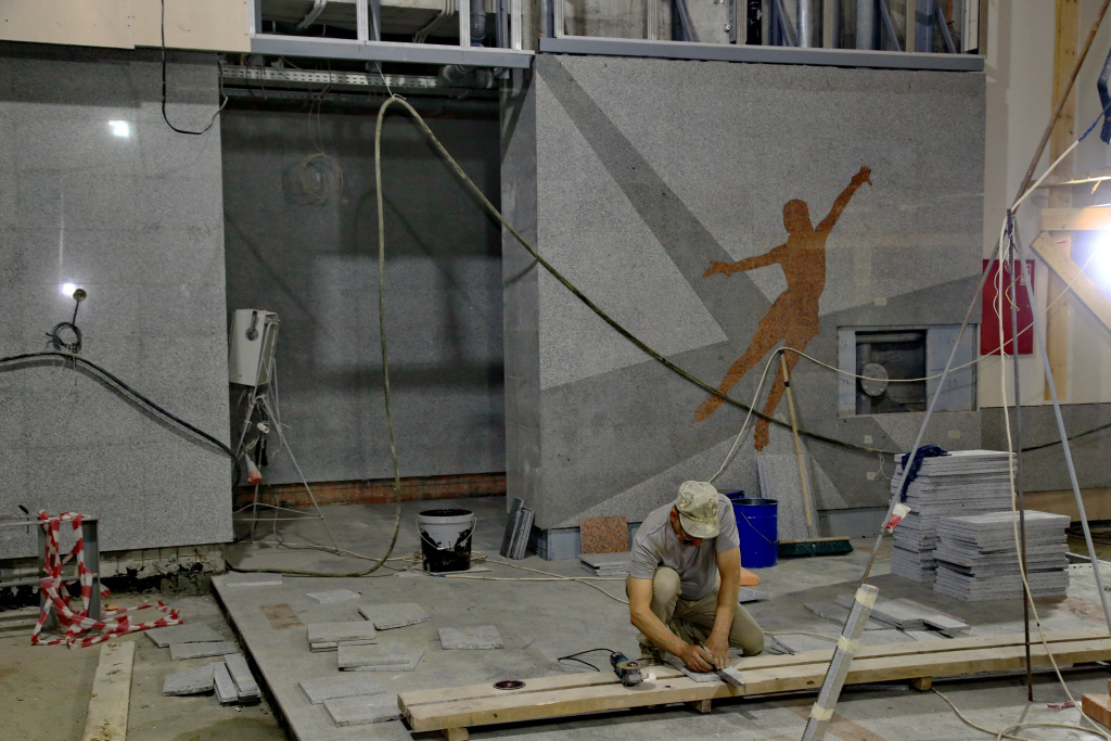 На стенах уже красуются трёхметровые панно с изображениями спортсменов. Эти композиции собирали вручную в Новосибирске из элементов гранита — ювелирная и сложная работа.