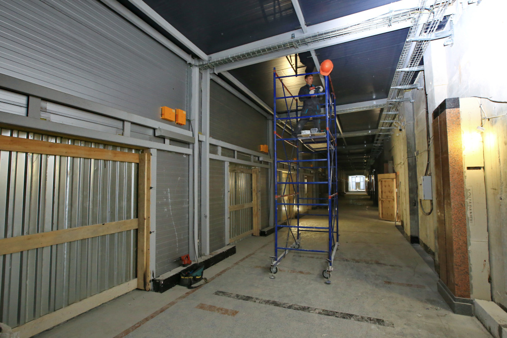 В вестибюле тоже кипит работа. Помещение занимает значительную часть пространства под метромостом, поэтому выглядит тут всё очень монументально.