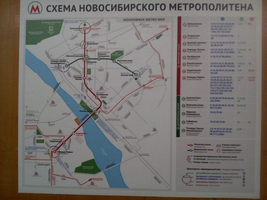 Кроме двух линий новосибирской подземки — красной Ленинской и зелёной Дзержинской — на новой схеме показаны и маршруты другого городского пассажирского транспорта — трамваев и электричек. Номера автобусных, трамвайных и троллейбусных маршрутов, привязанных к каждой станции метро, вынесены в отдельный столбик. Транспортно-пересадочные узлы отмечены кружками со стрелками.