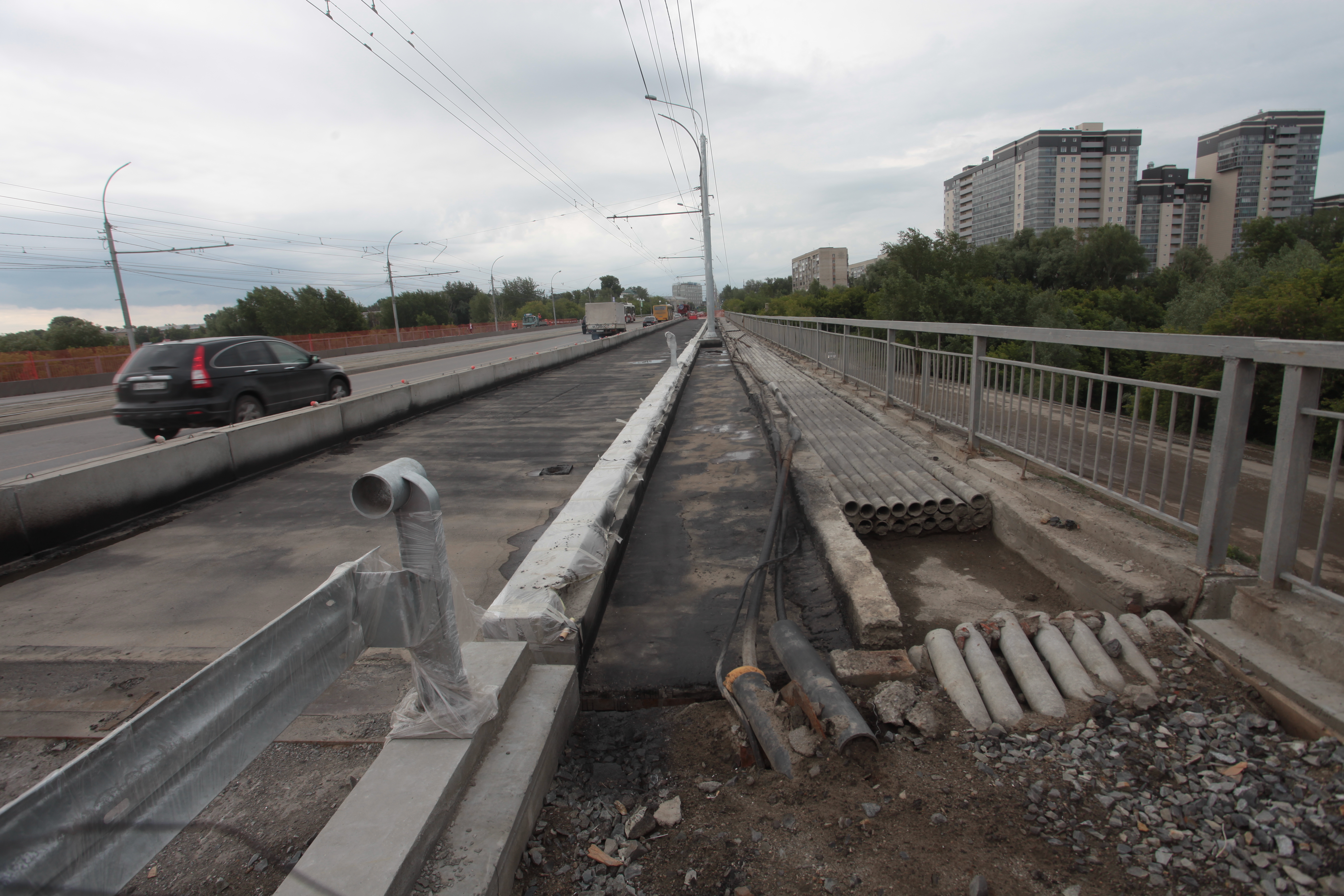 Вместе с ремонтом моста заменят и трамвайные рельсы. Работы идут по графику. Закончить их должны к началу октября.