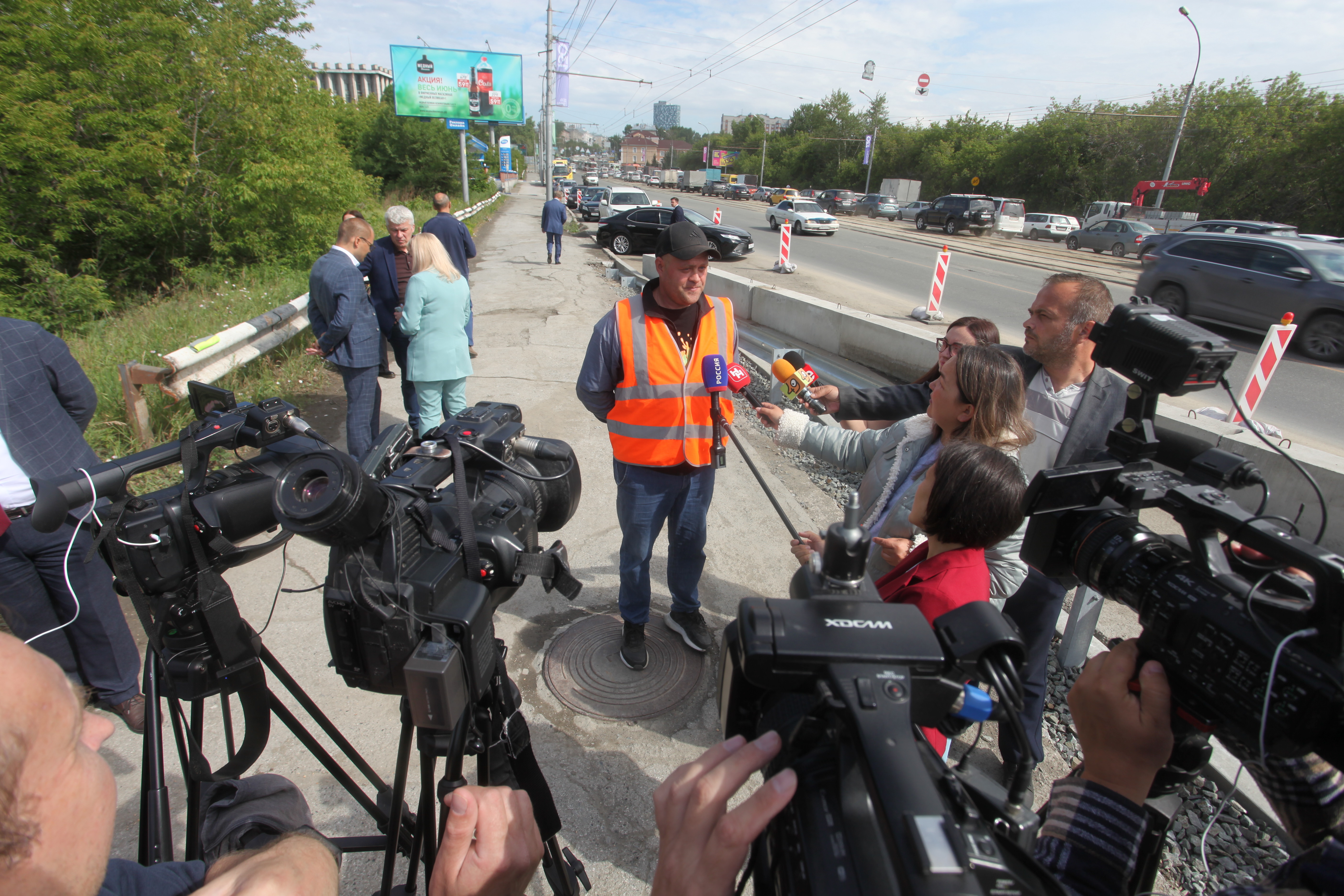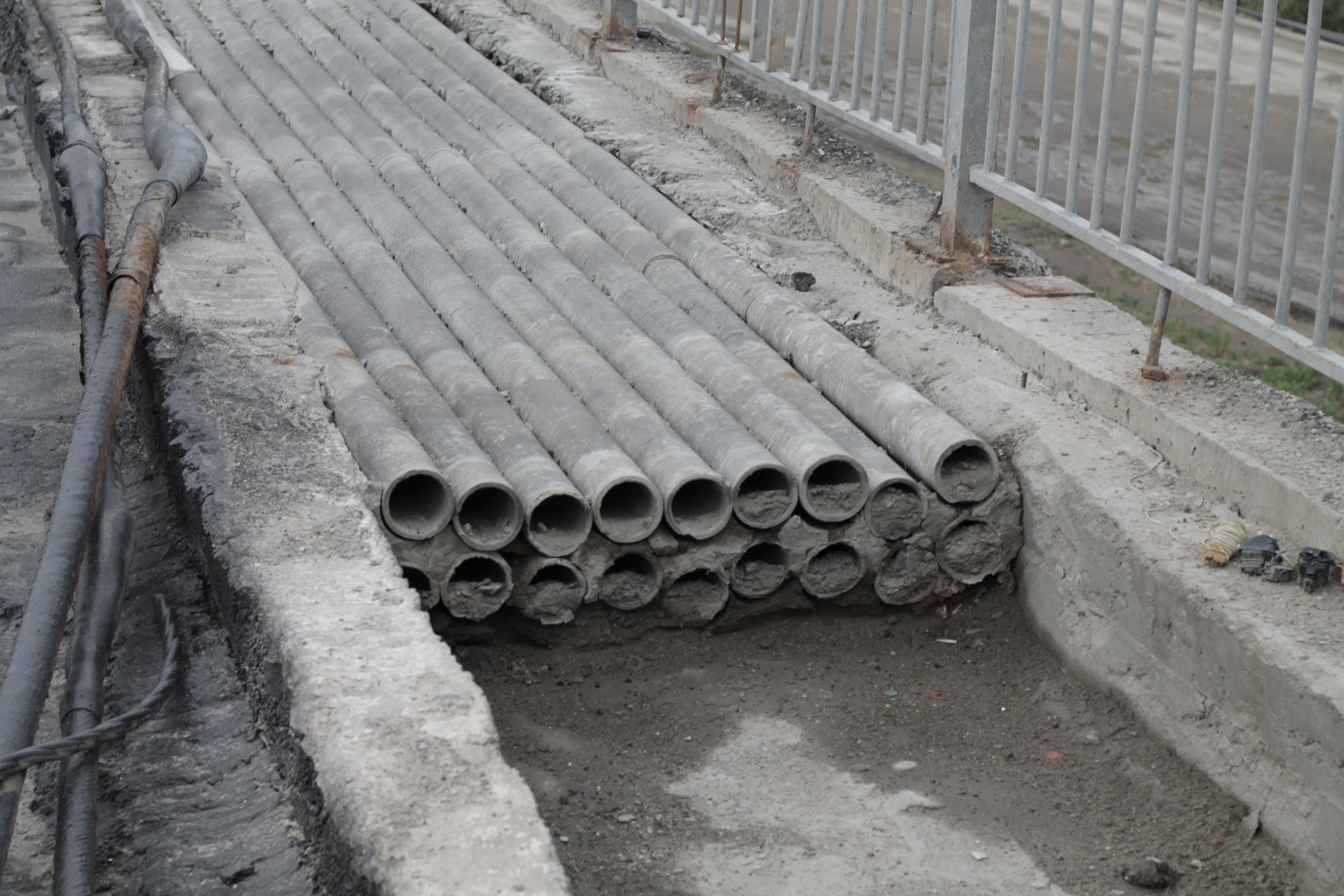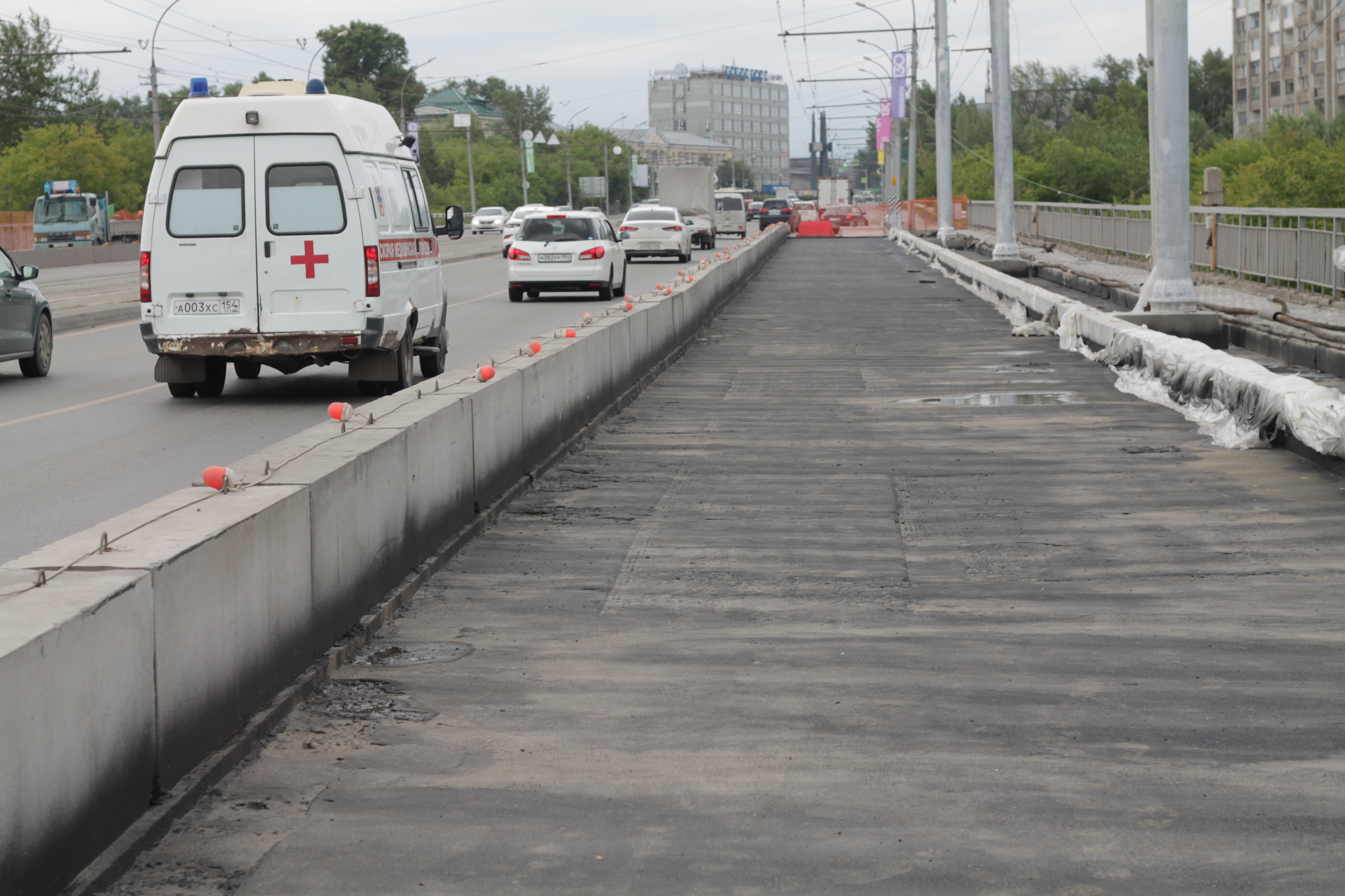 «Разборка конструкции произведена по двум полосам, замена монолитного цоколя под барьерные ограждения, ремонт проезжей части, нанесение распыляемой гидроизоляции. Армируем цоколь на другой стороне, будем выставлять опалубку и бетонировать. Сложное, интенсивное движение, приходится между машин бегать», — рассказал главный инженер подрядной организации Игорь Оксаниченко.