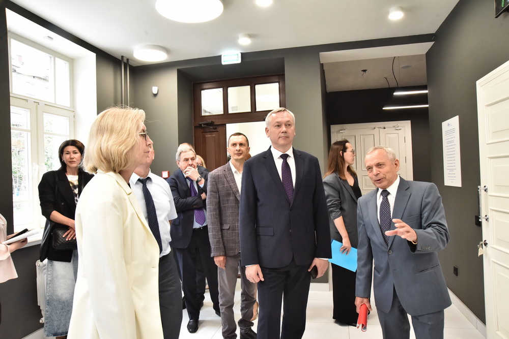 Накануне Дня строителя ход работ проконтролировал губернатор Андрей Травников. Он поблагодарил подрядчика за бережное восстановление исторического облика здания 1924 года.