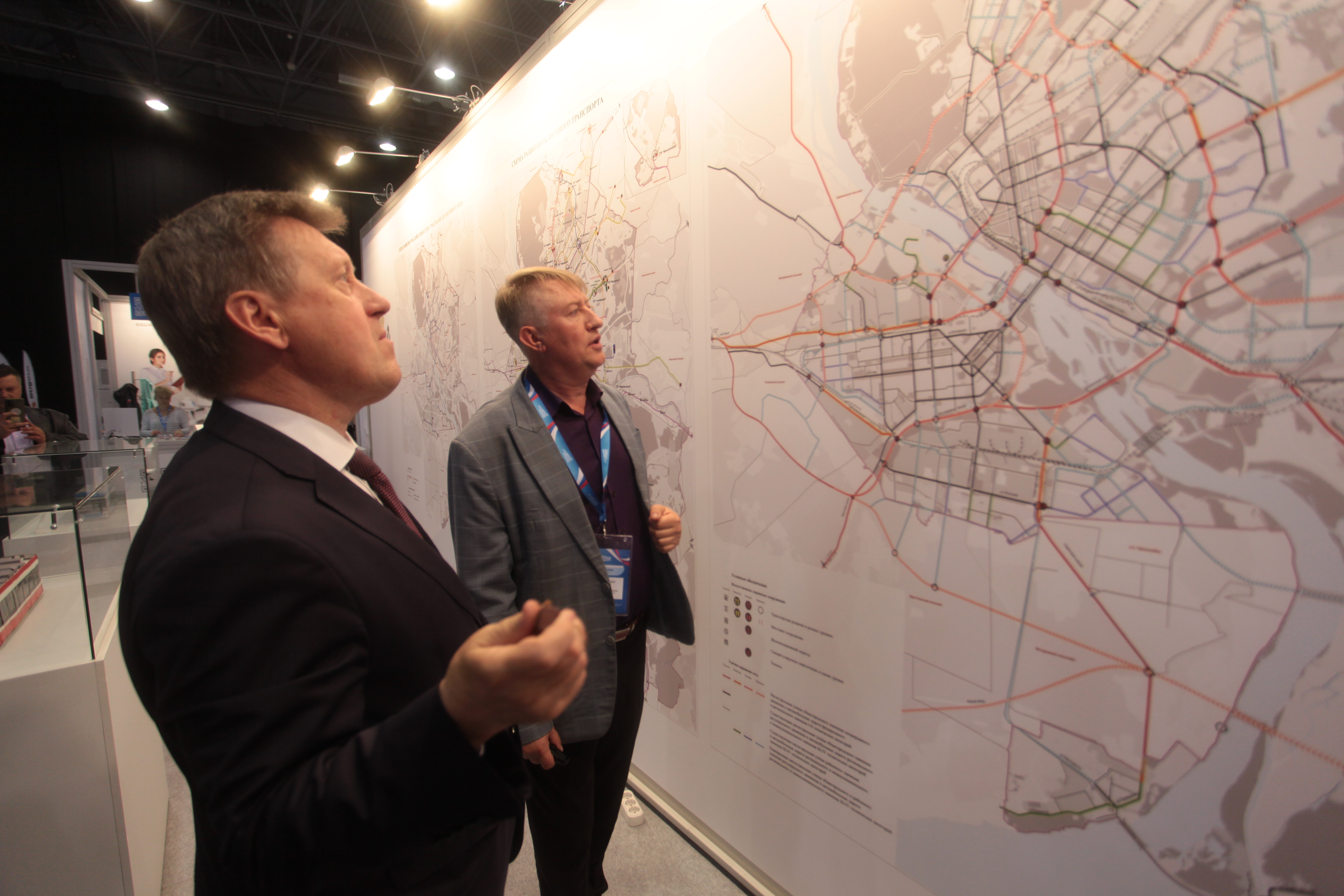 Власти города подготовили для выставки стенд, посвященный перспективам развития дорожно-транспортной инфраструктуры Новосибирска. Мэр Анатолий Локоть ознакомил с ними помощника президента России Игоря Левитина.