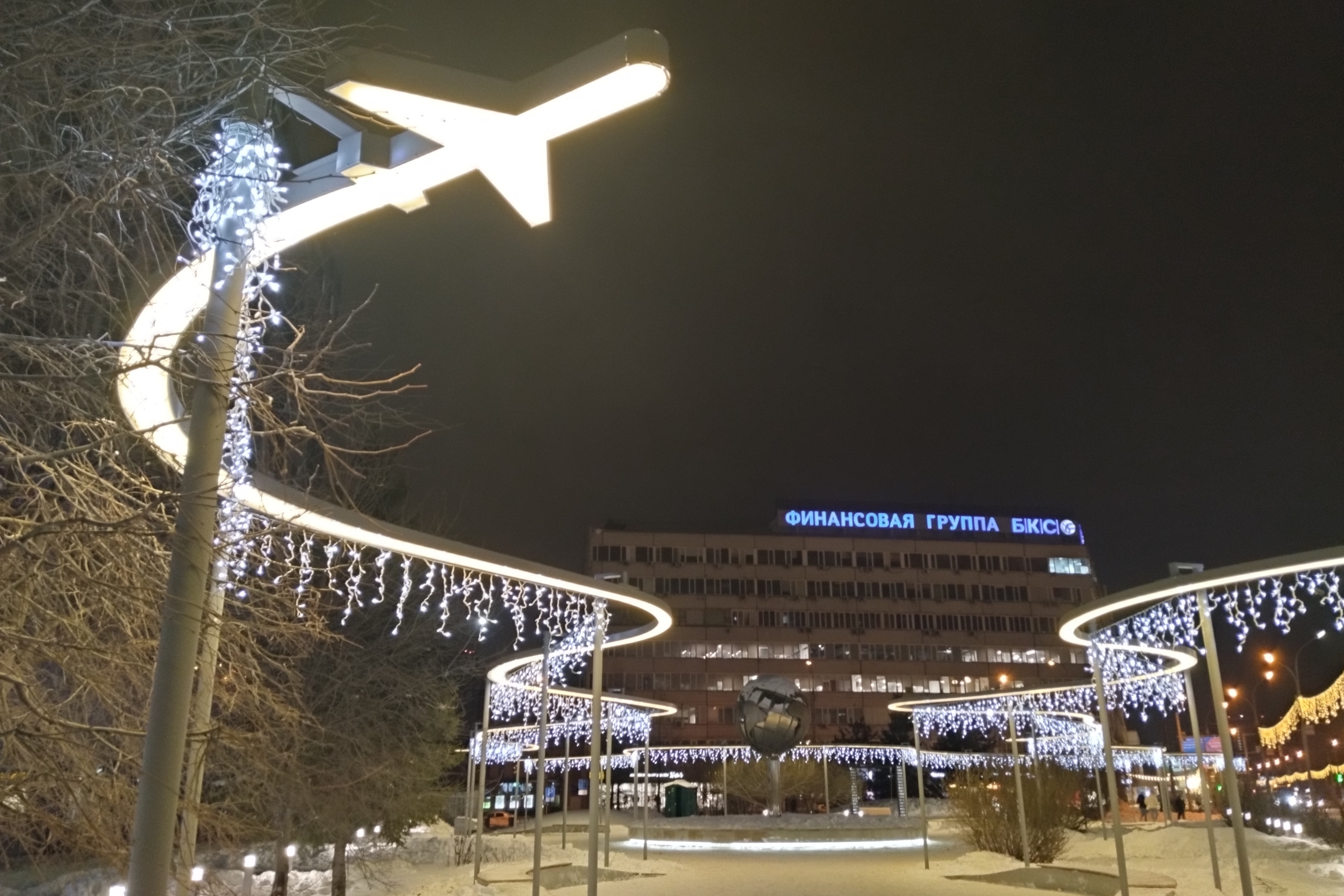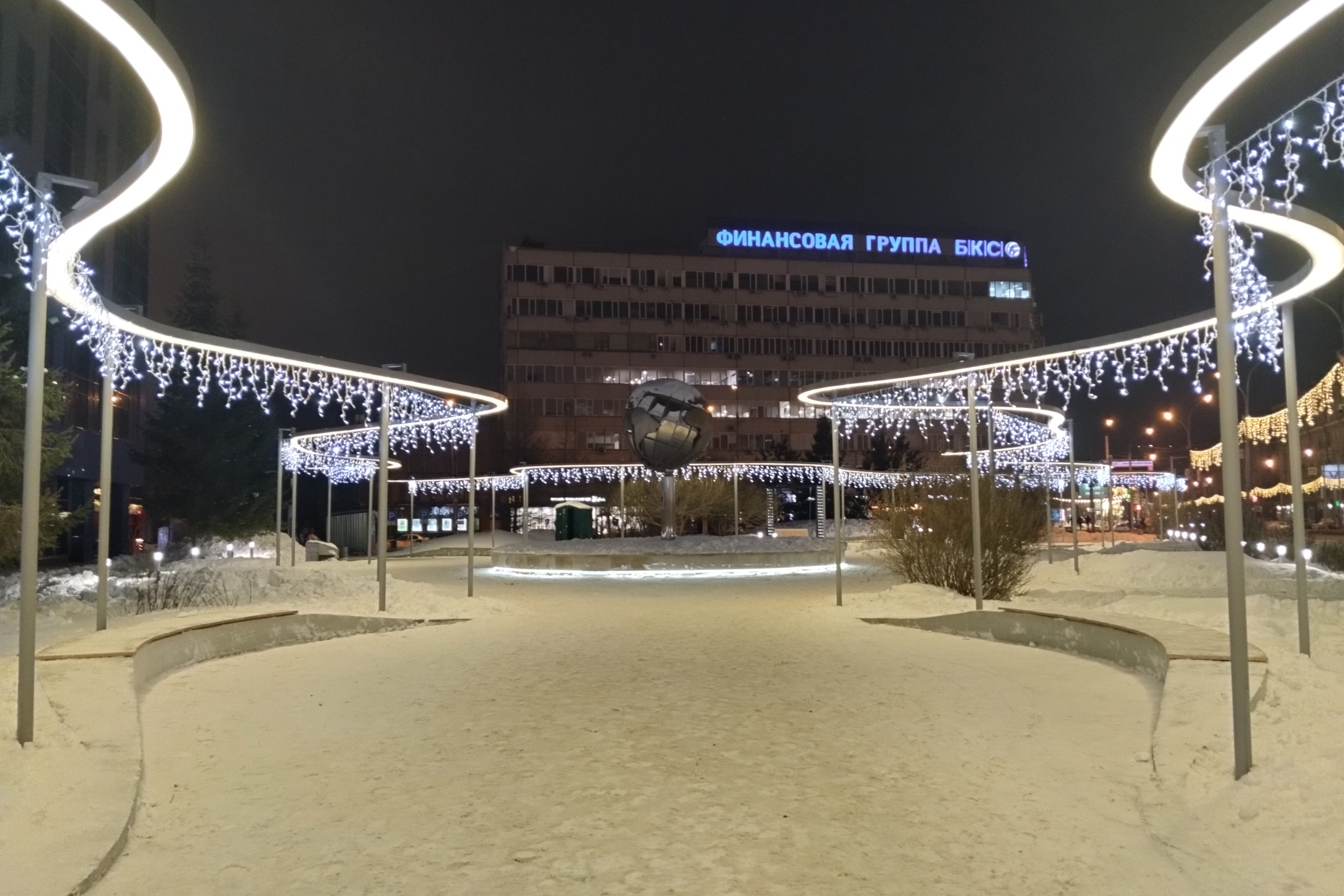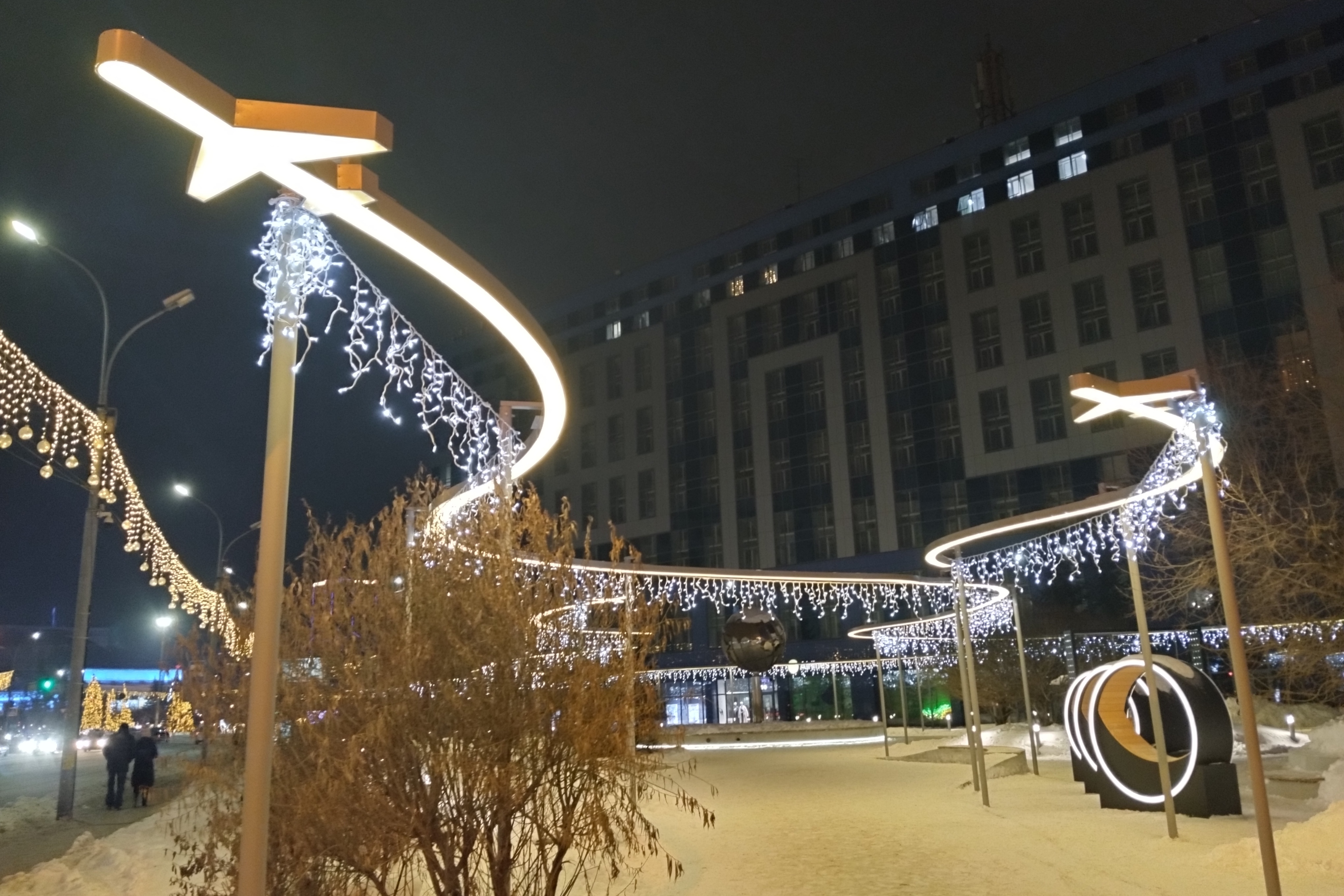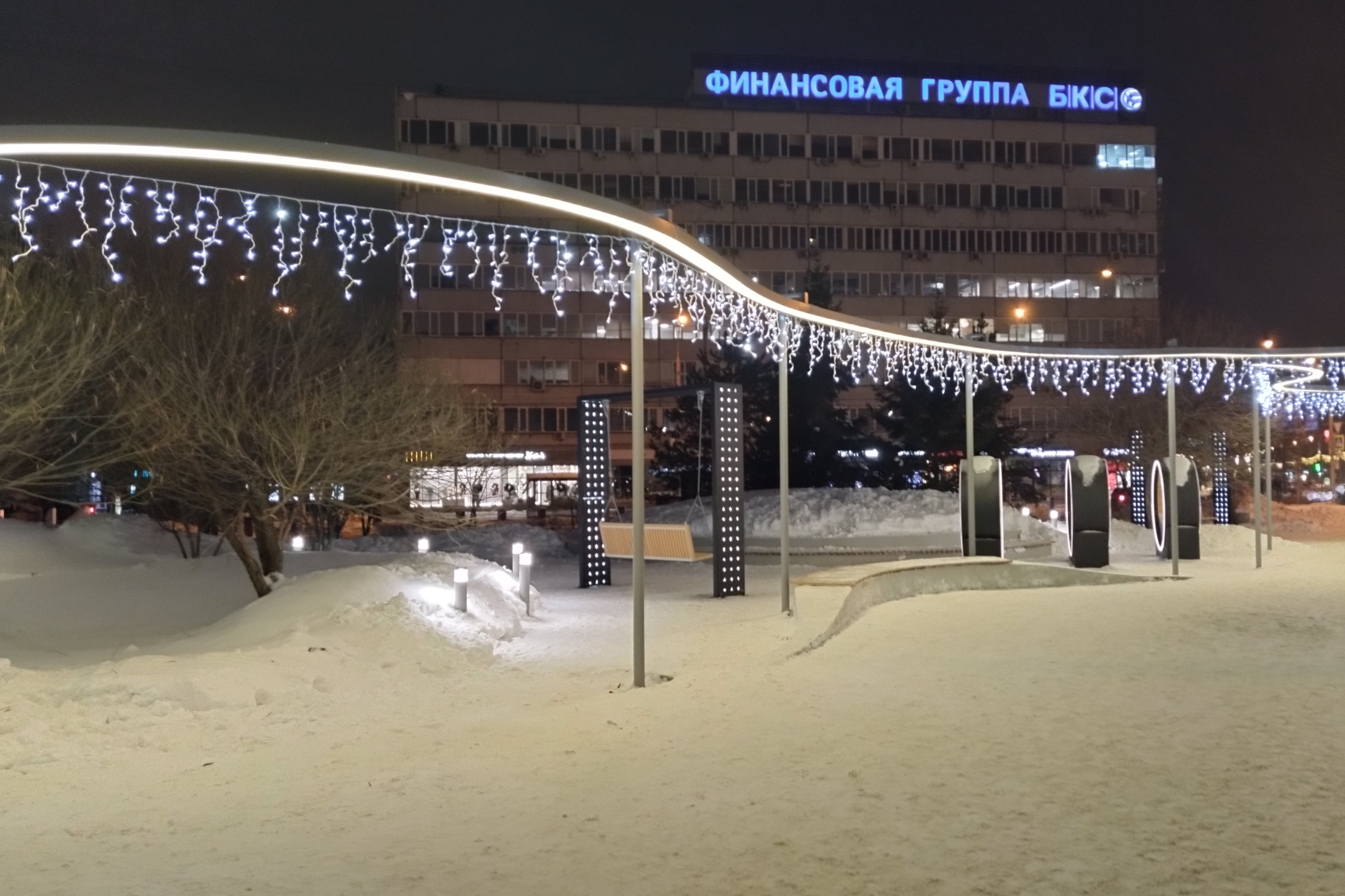 Вечером в понедельник, 25 декабря, в обновлённом сквере «Крылья Сибири» на улице Орджоникидзе включили эффектную иллюминацию.
