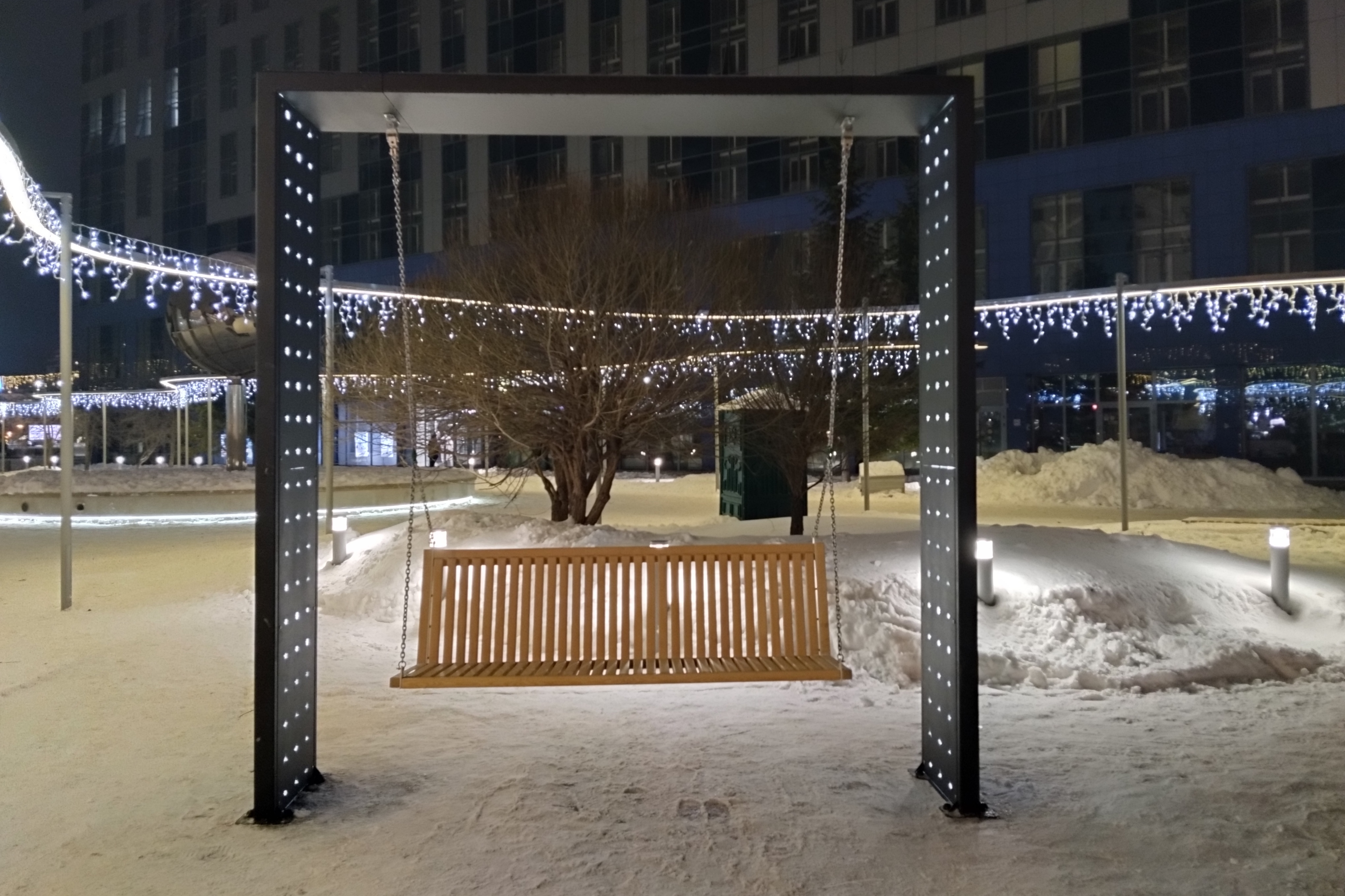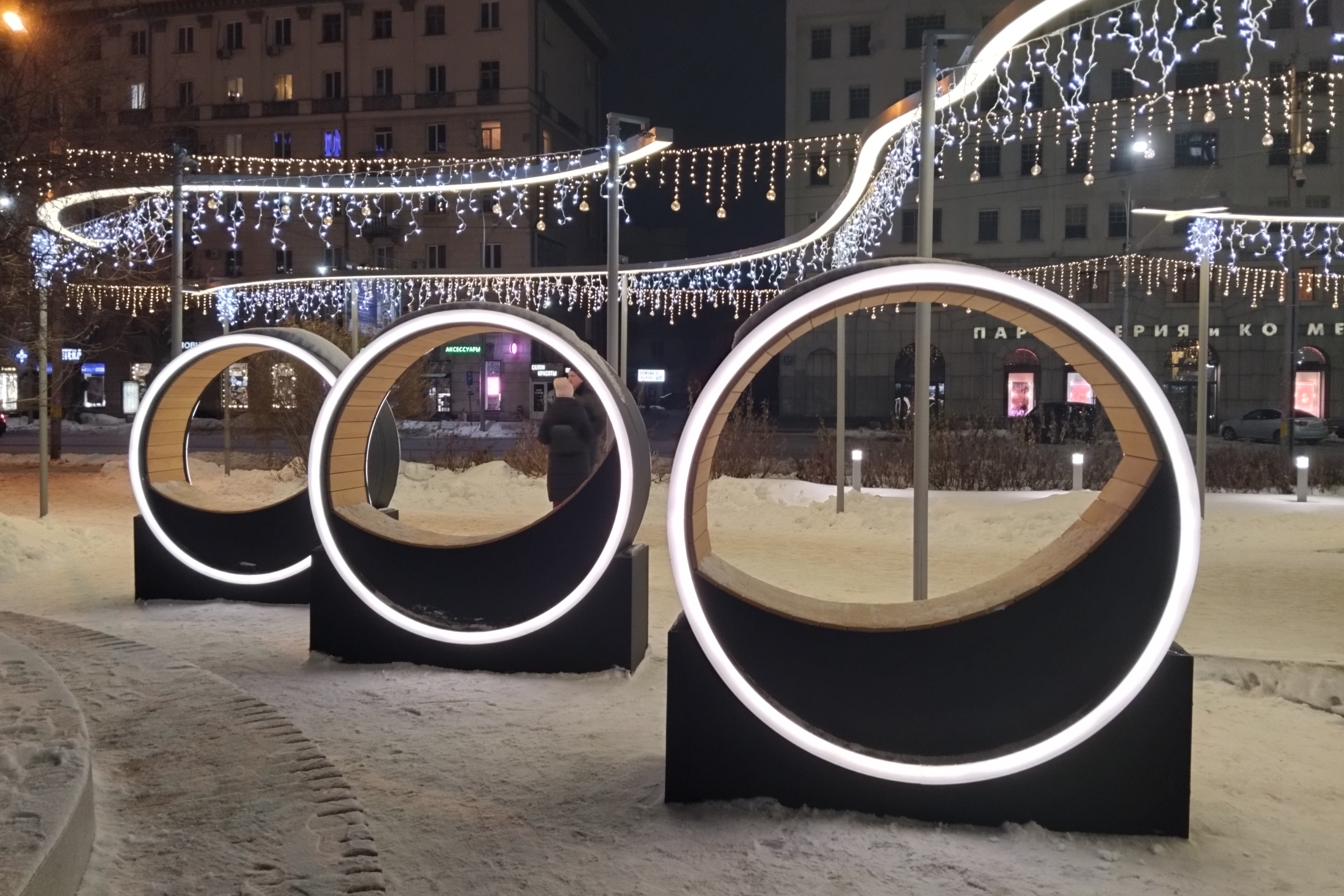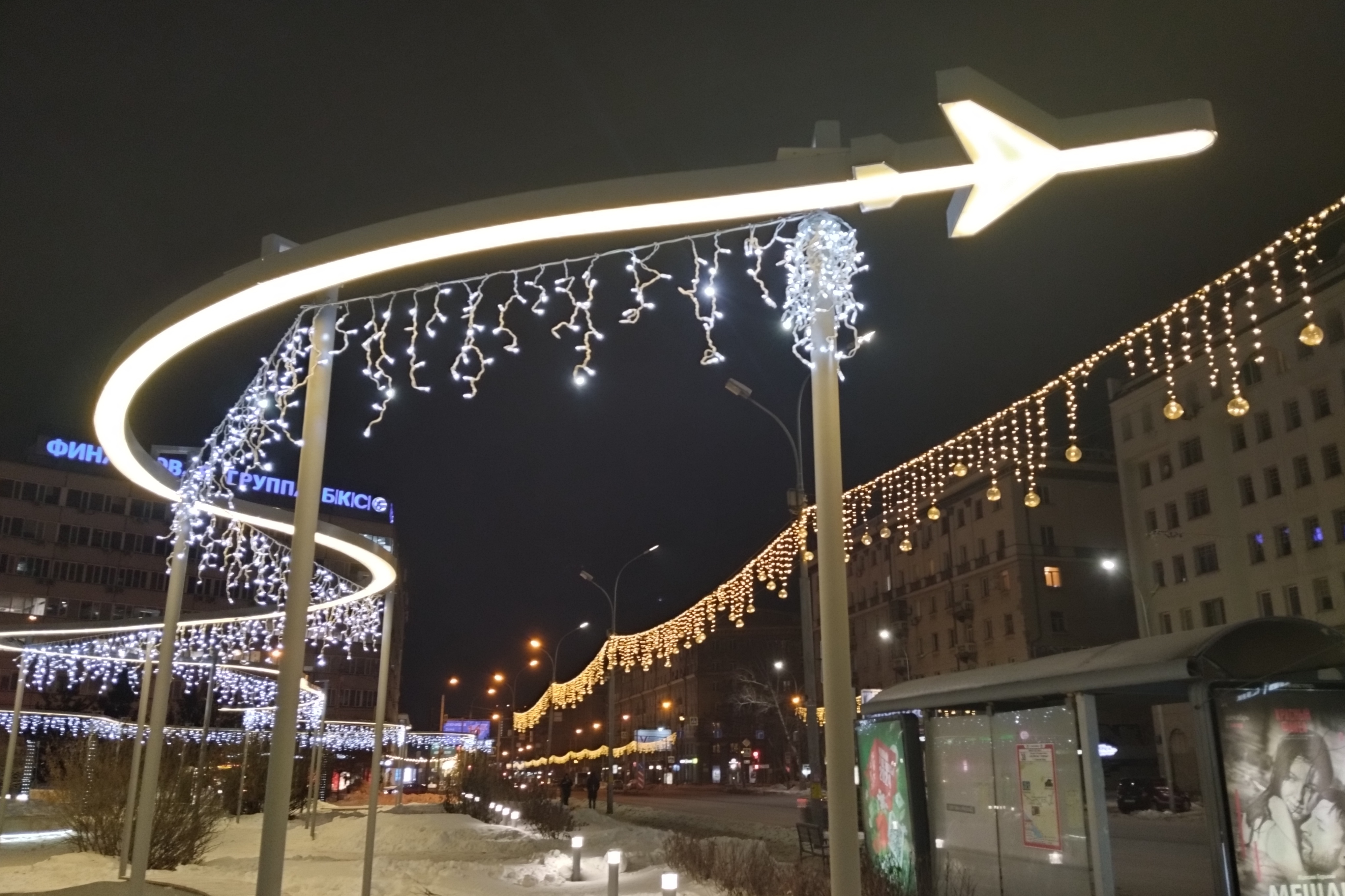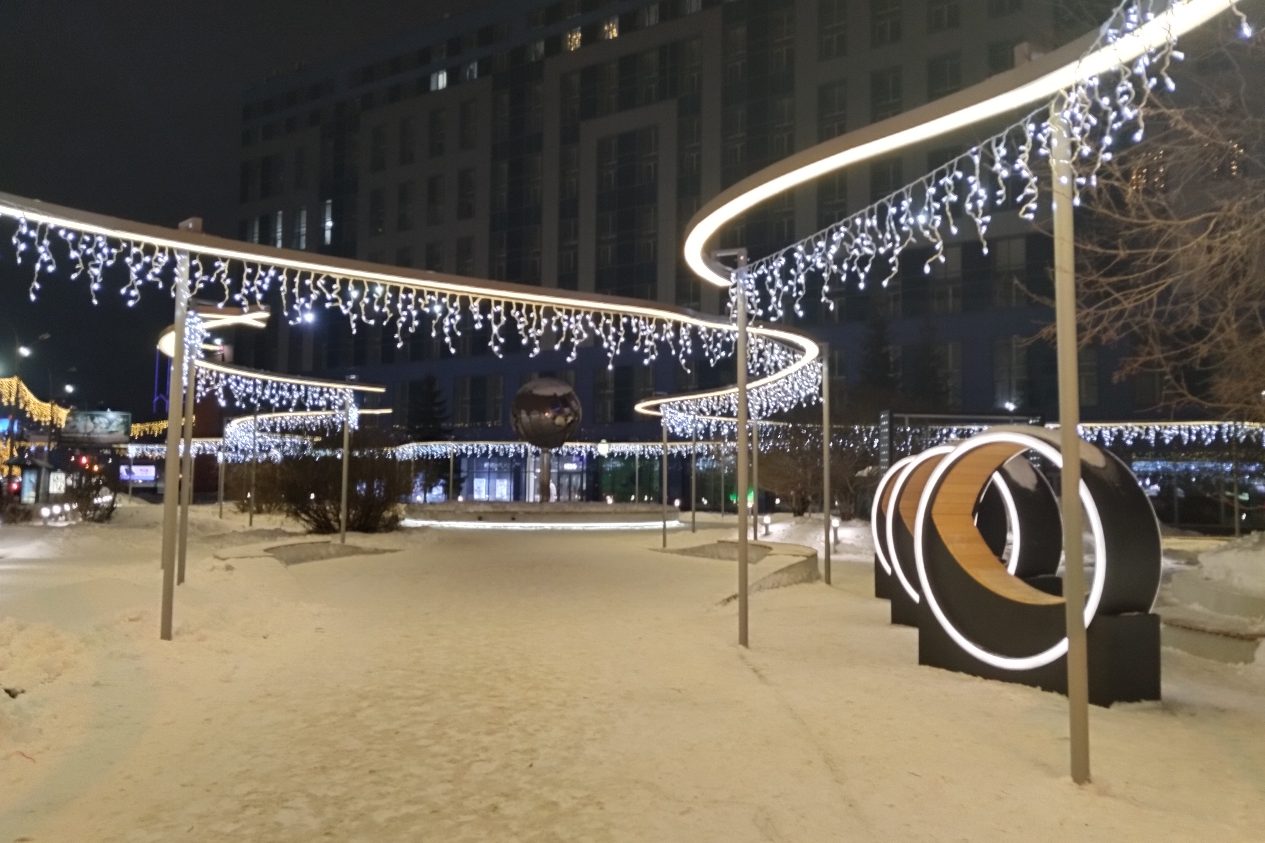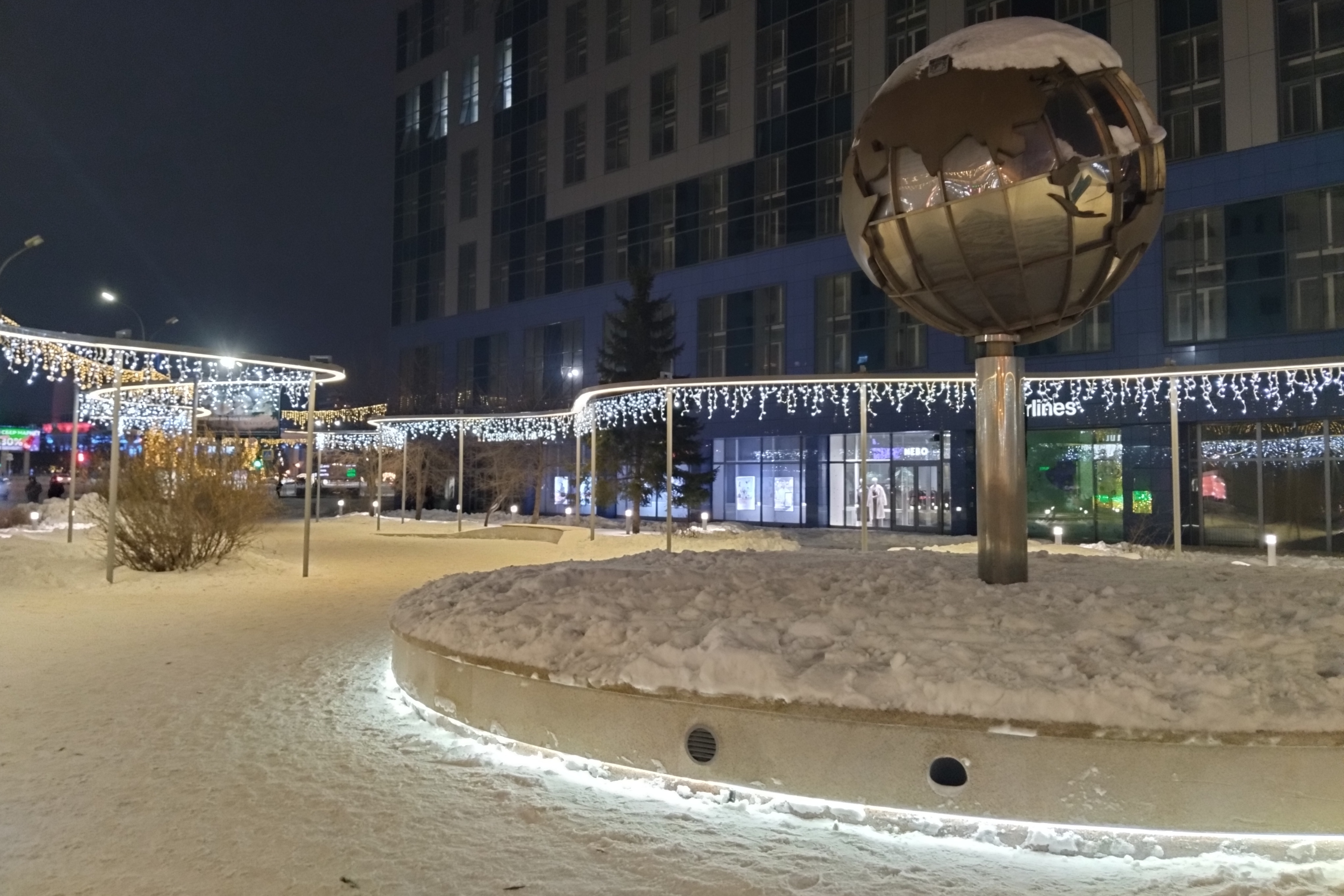 Вечером в понедельник, 25 декабря, в обновлённом сквере «Крылья Сибири» на улице Орджоникидзе включили эффектную иллюминацию.