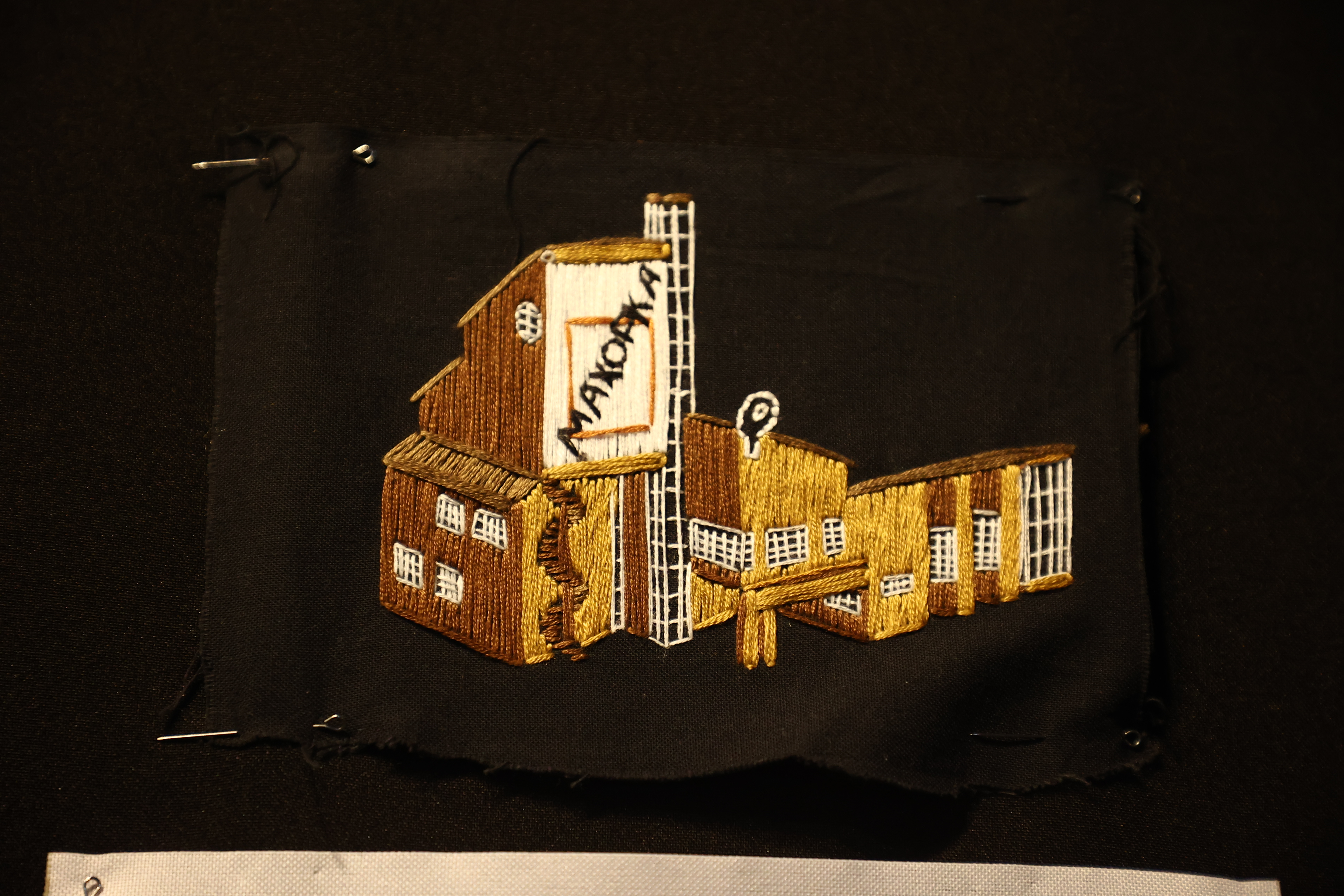 Первым вышитым объектом стала школа имени КИМа, построенная в Ленинграде в конце 1920-х годов. Однако работу художник в итоге распустил и до сих пор не воссоздал это здание по разным причинам.