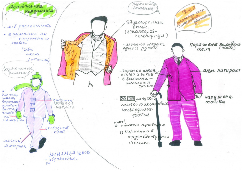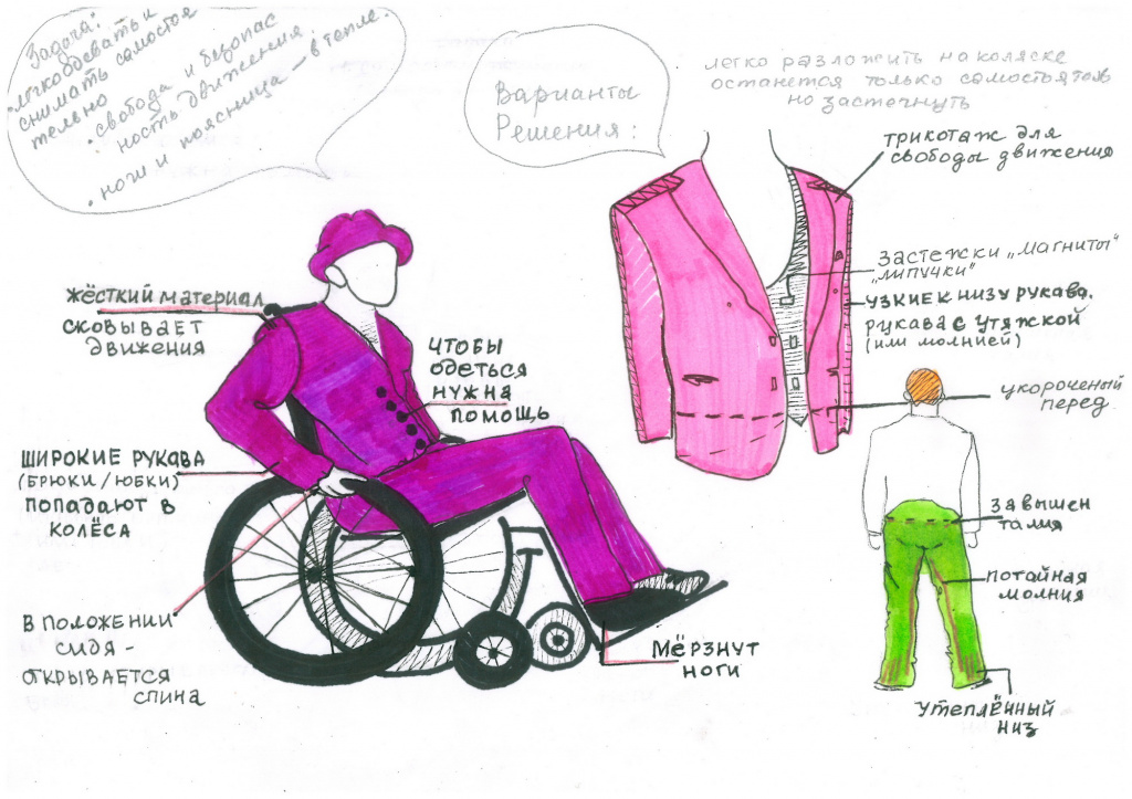 Профессор, доктор медицинских наук, который нас консультирует, вносит очень важные дополнения: объясняет мне особенности функционирования организма с тем или иным диагнозом. Например, люди на инвалидных колясках, в силу нарушения чувствительности отдельных частей тела, могут не чувствовать, что они вспотели или замерзли. Попадая в тёплое помещение, человек намок и не заметил этого. Вышел вспотевший на холод, замерз, и тоже этого не заметил. И первое, что всегда попадает под удар — почки. Поэтому, кстати, в плаще появилась дополнительная деталь — пояс на тонком утеплителе, чтобы закрыть спину.