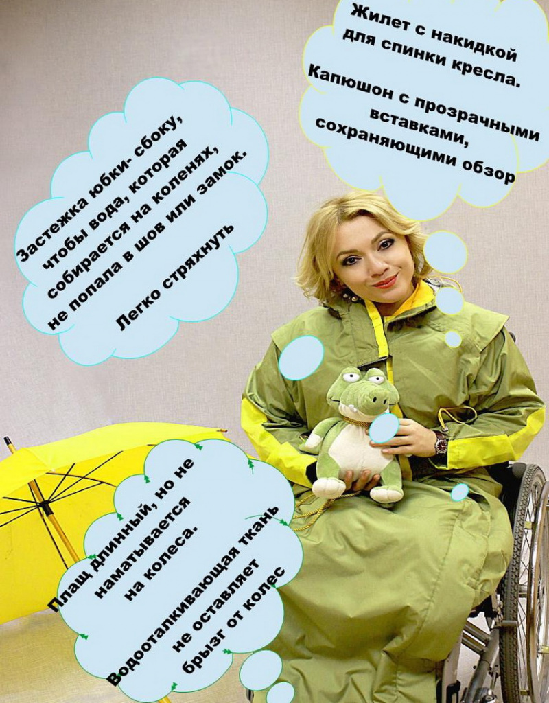«Моя задача — продумать их и воплотить. Сначала на ум приходят, казалось бы, очевидные вещи: зонтик и инвалидное кресло для самостоятельного колясочника — вещи несовместимые. Тут либо то, либо другое. Предполагаешь, что решить дилемму — либо прятаться от дождя, либо гулять — поможет дождевик. Следующее, на что обращаешь внимание — дождь льёт на колени и за спину — это совсем незащищённые места. К тому же, надо учитывать, что в дождь бывает холодно. Деталь за деталью продумываешь, какой функцией наделять каждый элемент одежды».
