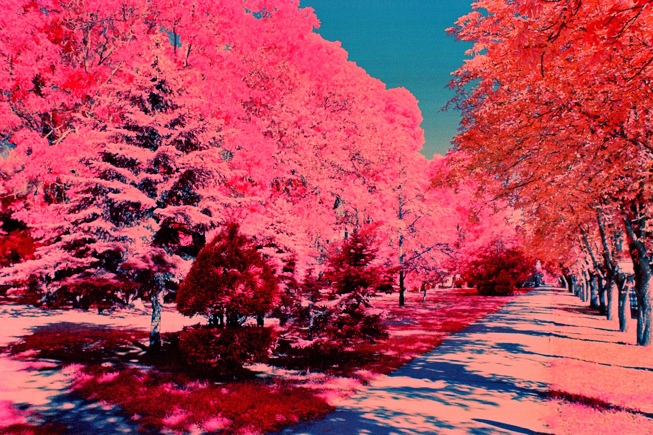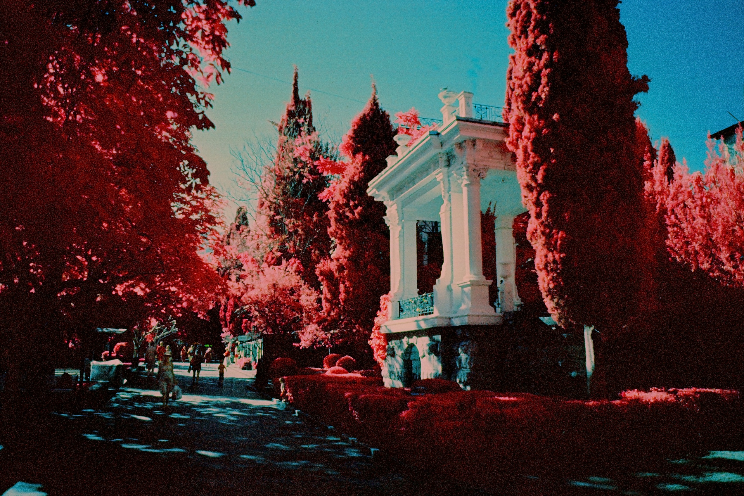 Инфракрасная плёнка воспроизводит цвета не совсем предсказуемо. Единственное, что понятно — это то, что инфракрасные лучи она передаёт красно-пурпурным цветом. Хлорофилл, содержащийся в листве и траве, отражает ИК-излучение. Так растения защищаются от перегрева солнцем. Это и регистрирует плёнка.