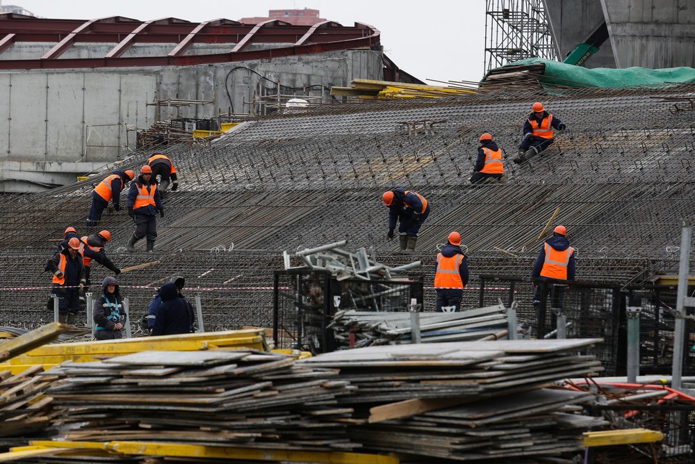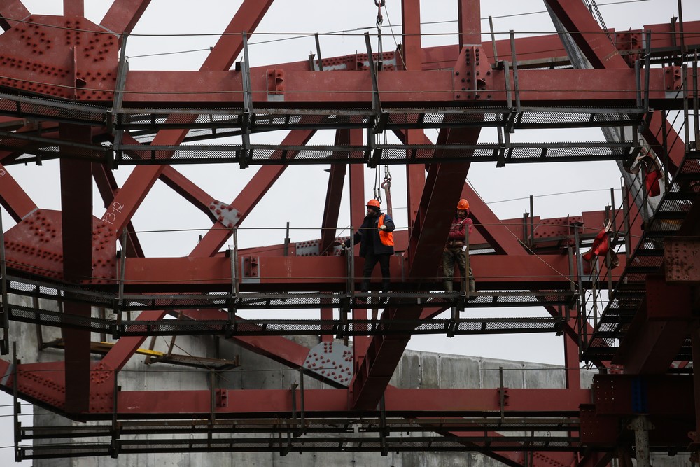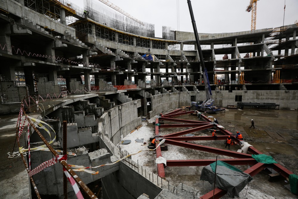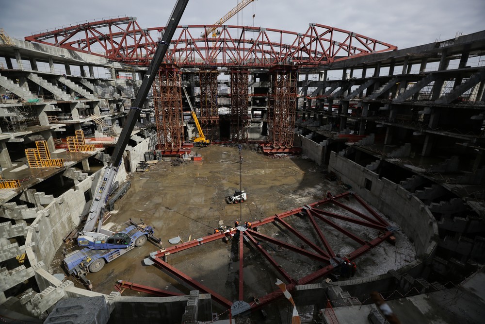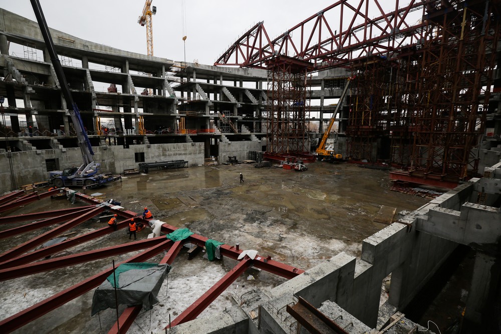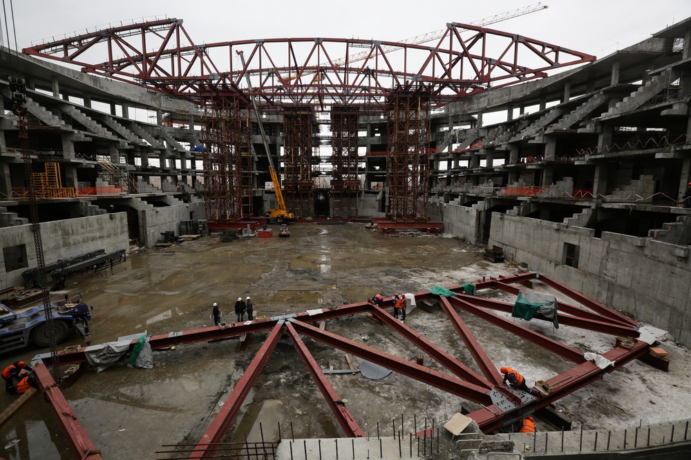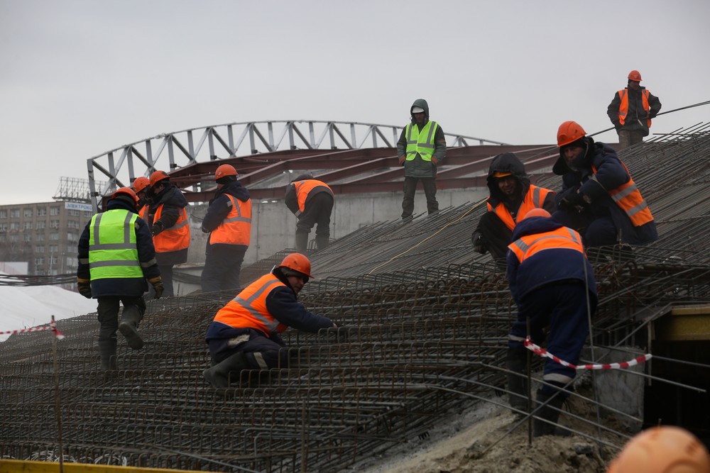 Сейчас на стройплощадке ледовой арены работают около 500 человек. Летом будет вдвое больше. Все работы на спортивном объекте ведут параллельно. Пока одни строители возводят бетонный каркас, другие уже собирают металлические конструкции кровли, а монтёры прокладывают вентиляционные каналы и электропроводку.