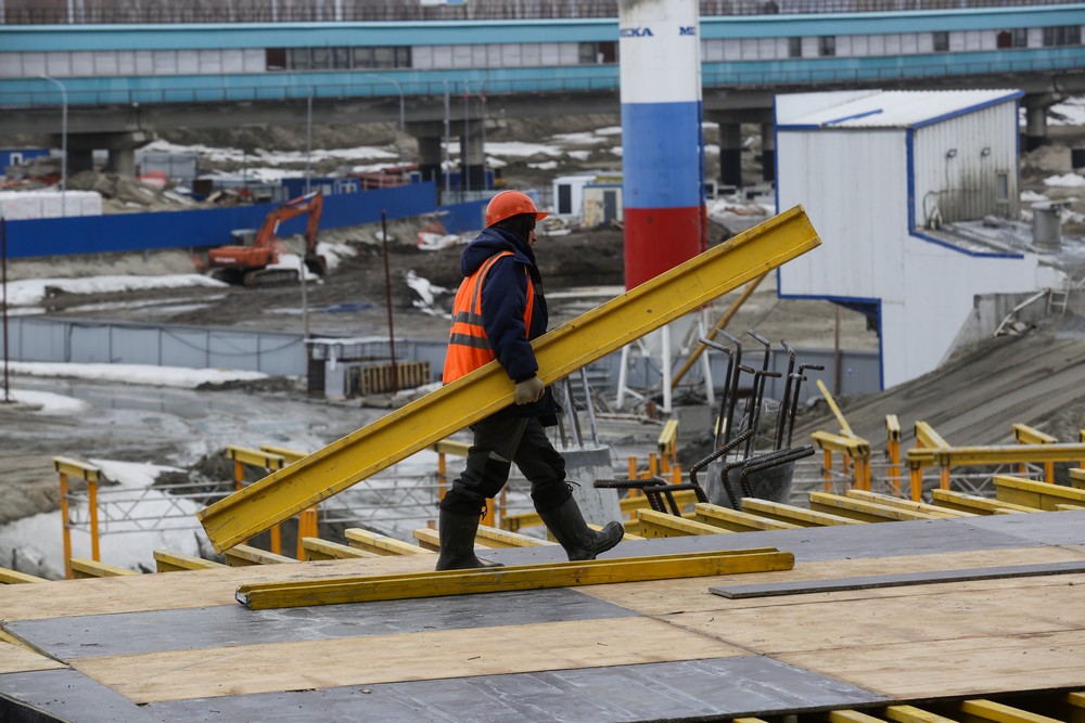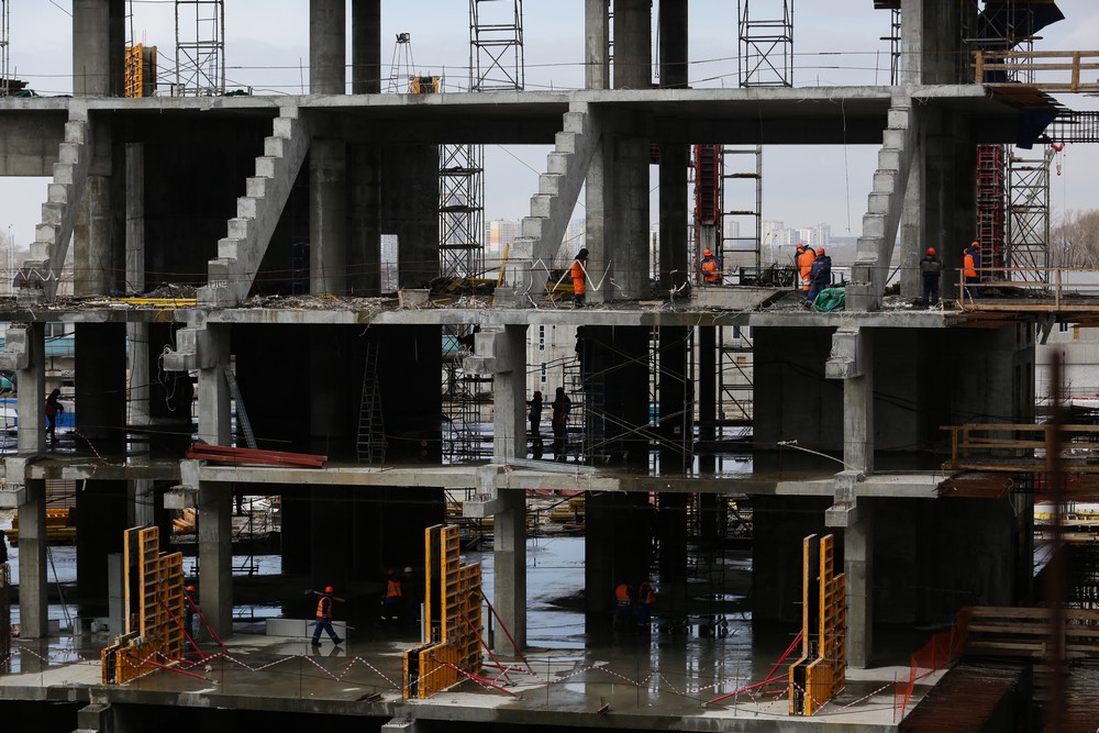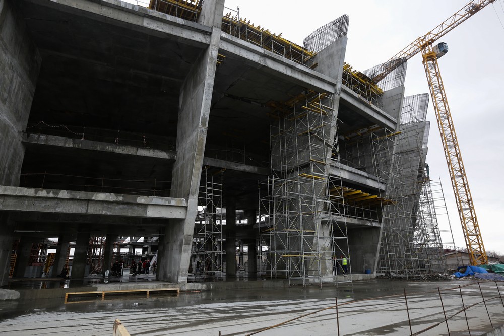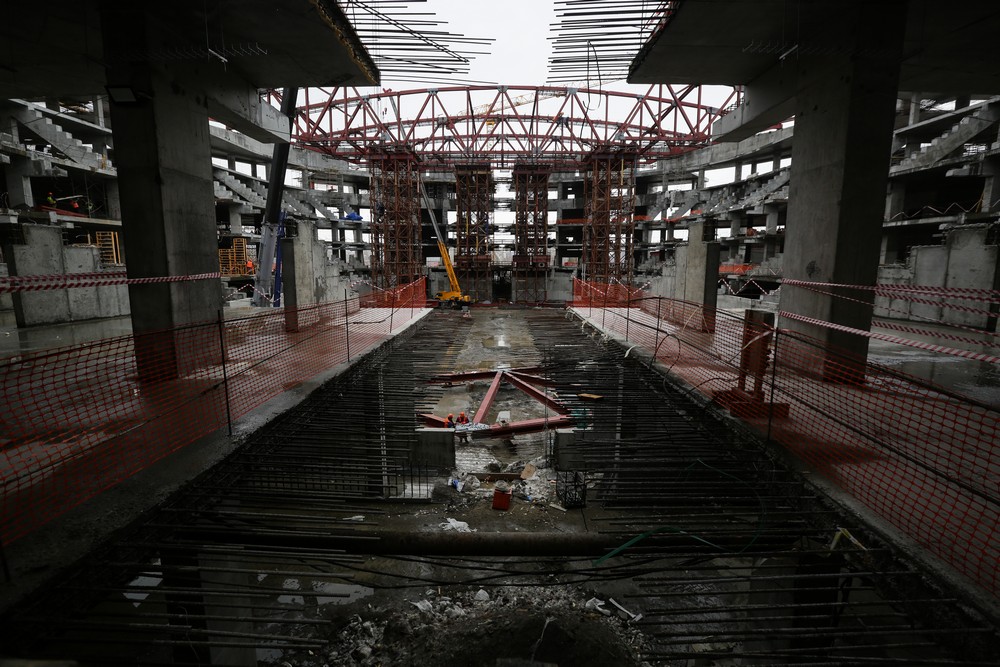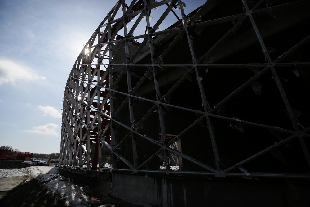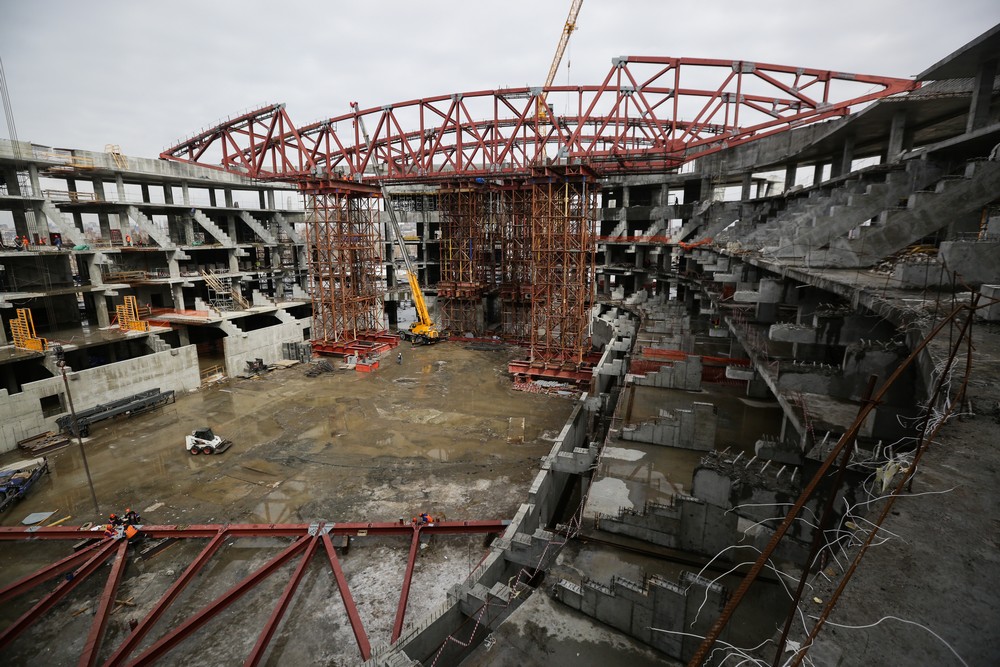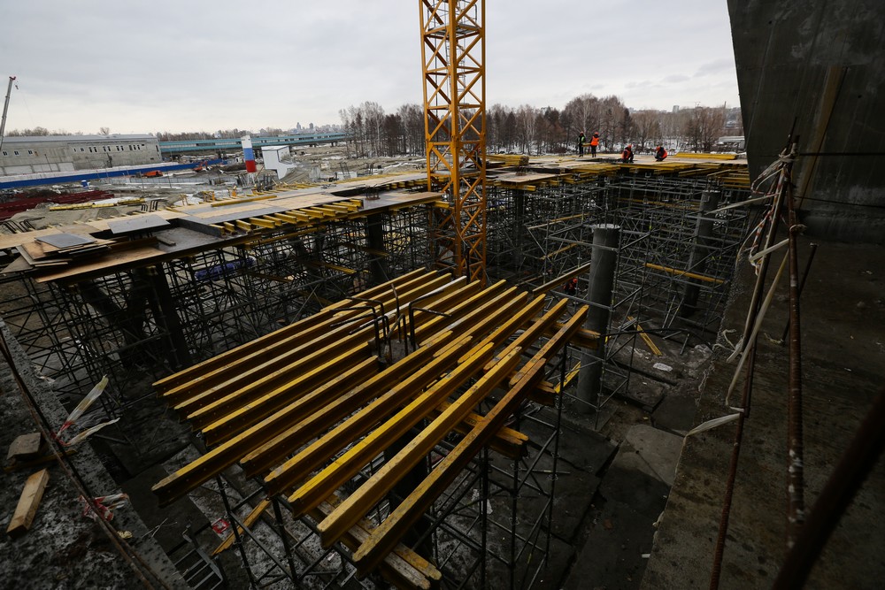 Сейчас на стройплощадке ледовой арены работают около 500 человек. Летом будет вдвое больше. Все работы на спортивном объекте ведут параллельно. Пока одни строители возводят бетонный каркас, другие уже собирают металлические конструкции кровли, а монтёры прокладывают вентиляционные каналы и электропроводку.