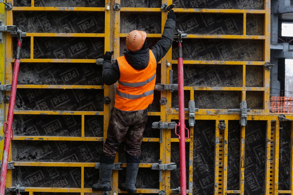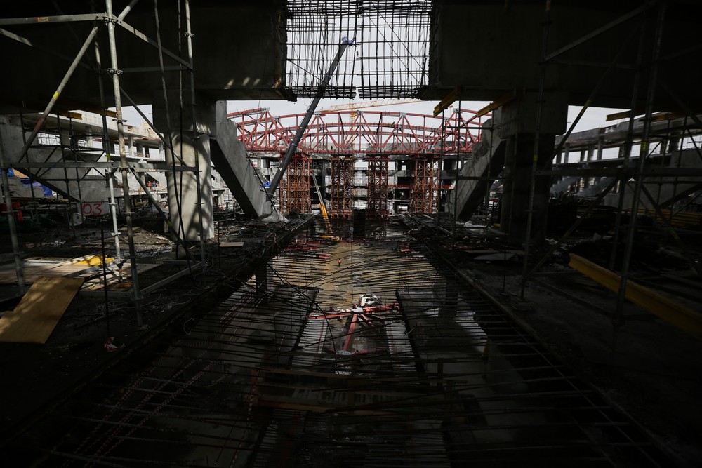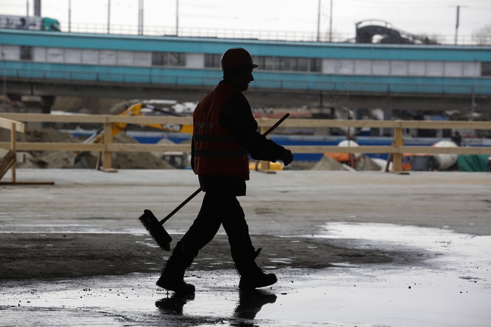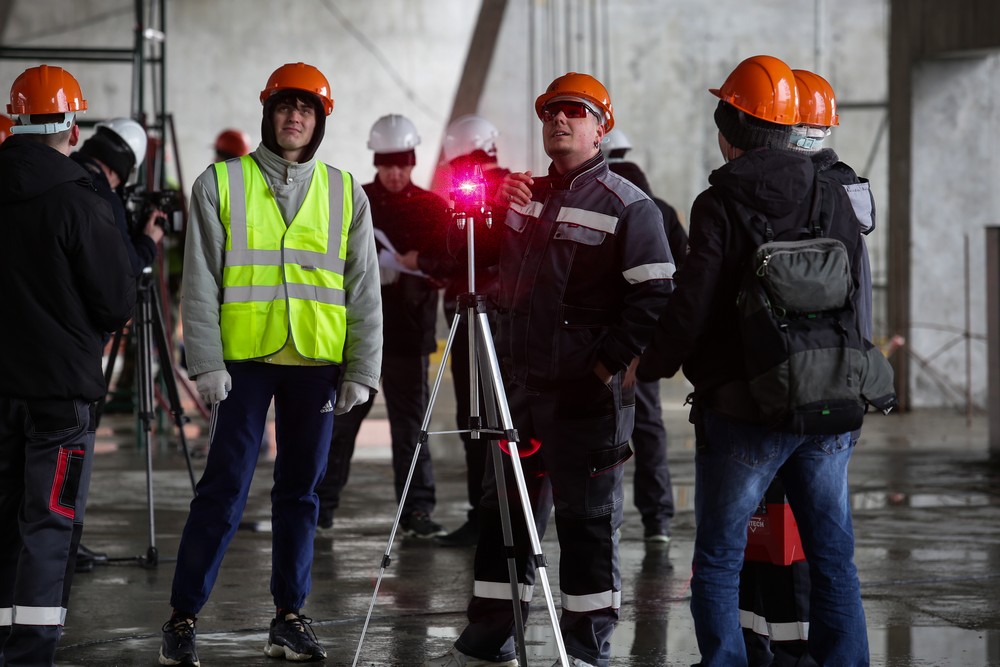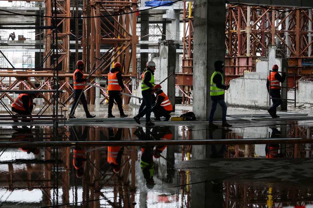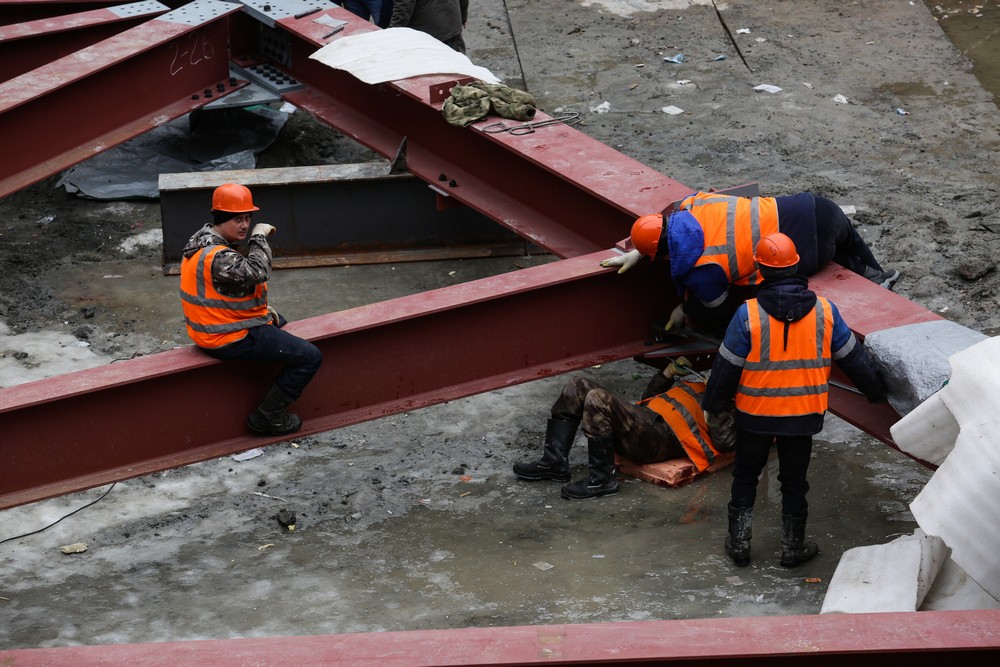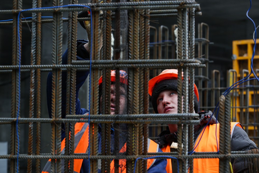 Сейчас на стройплощадке ледовой арены работают около 500 человек. Летом будет вдвое больше. Все работы на спортивном объекте ведут параллельно. Пока одни строители возводят бетонный каркас, другие уже собирают металлические конструкции кровли, а монтёры прокладывают вентиляционные каналы и электропроводку.