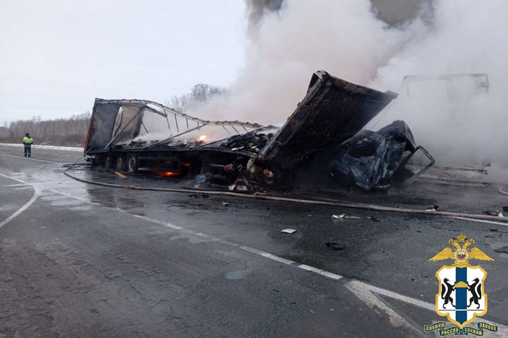 По данным полиции, КАМАЗ, двигавшийся со стороны Омска в направлении Новосибирска, выехал на встречную полосу. При этом машина сначала по касательной столкнулась с грузовиком Shacman, а после — со встречным Volvo.