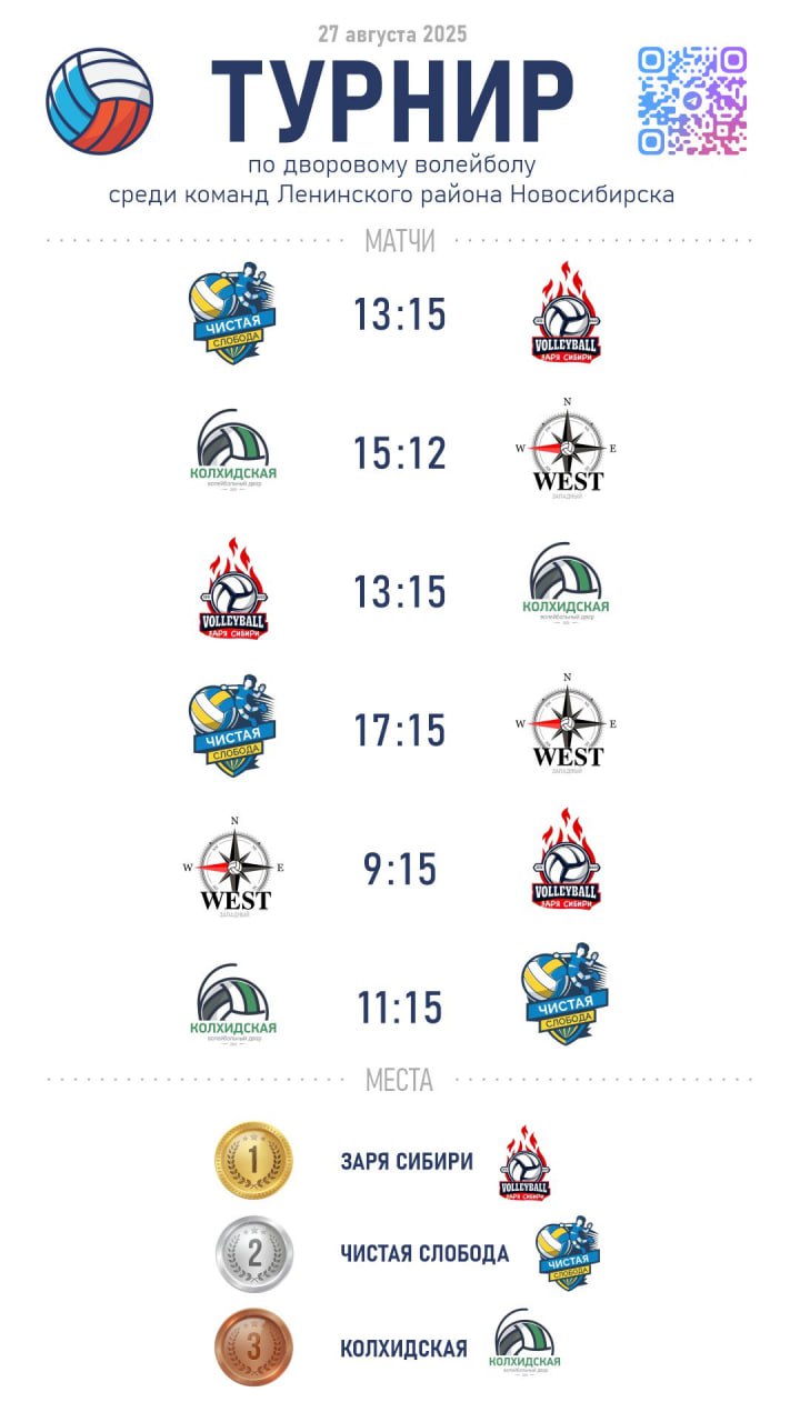 Волейбольное сообщество Западного жилмассива и микрорайона Чистая Слобода решили завершить это лето ярко и спортивно — дружеским турниром на дворовой волейбольной площадке по улице Колхидской. В соревновании участвовали четыре любительских команды: «Колхидская» (сборная дома), «WEST» (сборная Западного жилмассива), «Заря Сибири» (сборная любительской секции в ЦСП «Заря») и «Чистая Слобода» (сборная микрорайона). Победителя определили по выигранным партиям и разнице забитых мя...