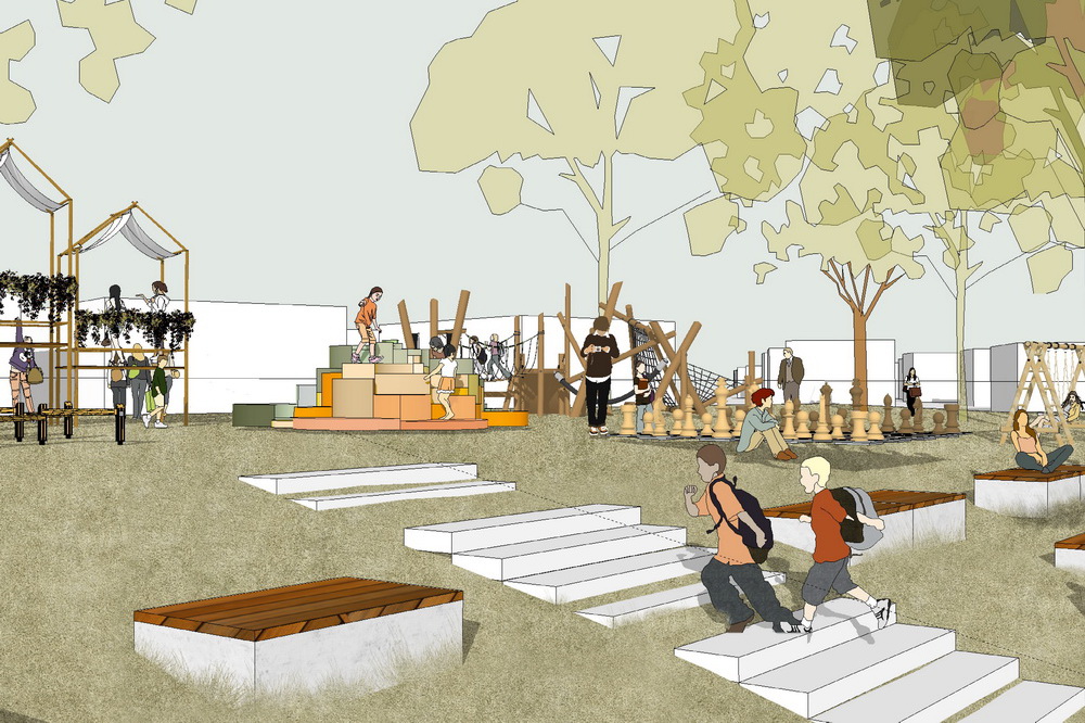 Также общественное пространство украсят фонтан и солнечные часы. Запланированы экстрим-парк, поле для мини-футбола и беговой маршрут.