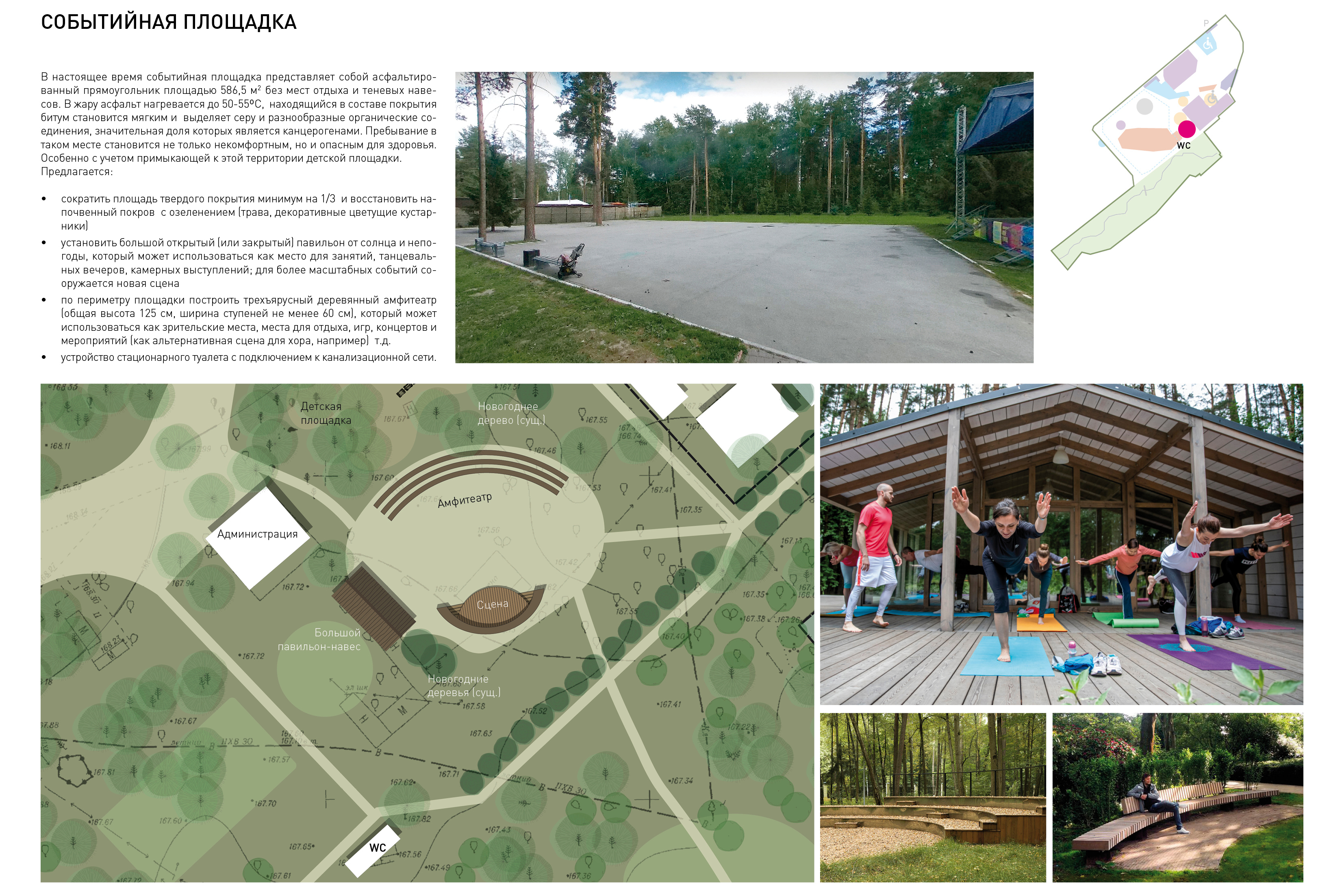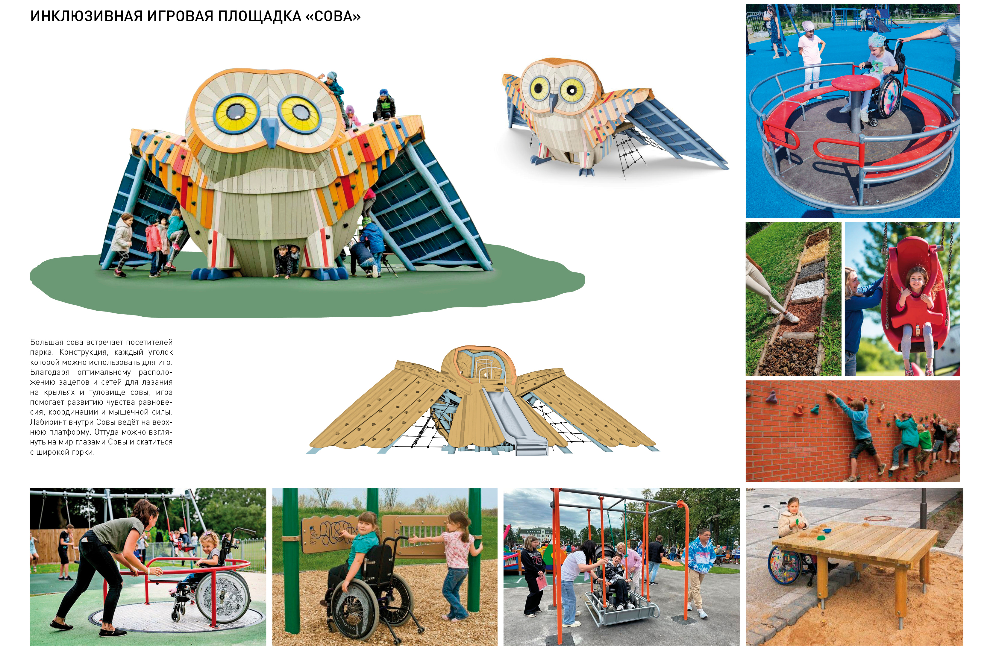 В парке обустроят событийную площадь со сценой, помещения для проката инвентаря, кафетерий, парковки, спортивные и детские локации, в том числе инклюзивную зону аттракционов. На ней посетителей будет встречать большая сова. Это конструкция с лабиринтом, множеством зацепов и сетей для лазания, каждый уголок которой можно использовать для игр.