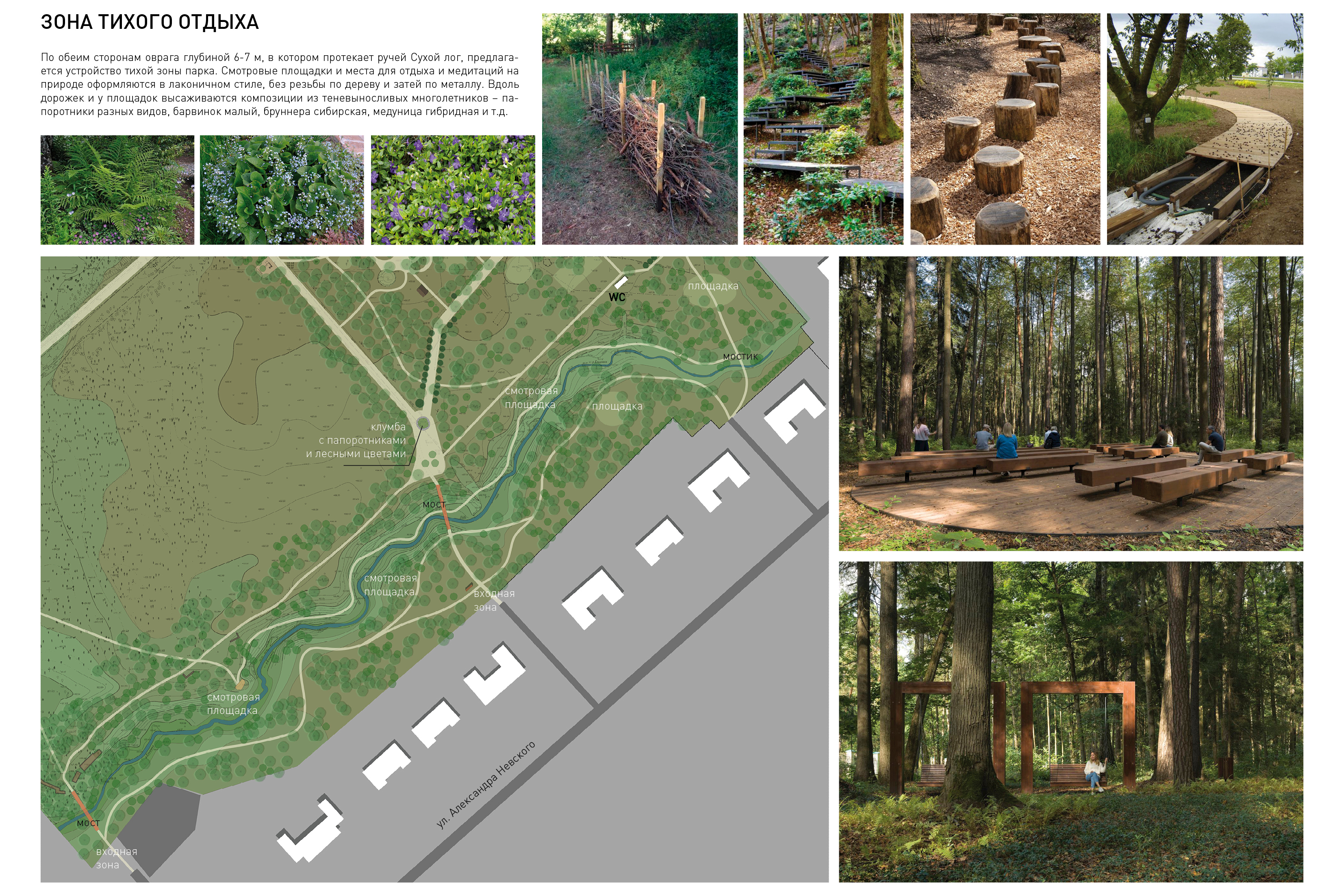 Благоустроить планируют 8,4 га, включая долину ручья Сухой Лог — её хотят задействовать для прогулок и тихого отдыха. В целом концепция предлагает сохранить сложившиеся функциональные зоны, обновив и расширив их возможности, а также добавив недостающие опции.