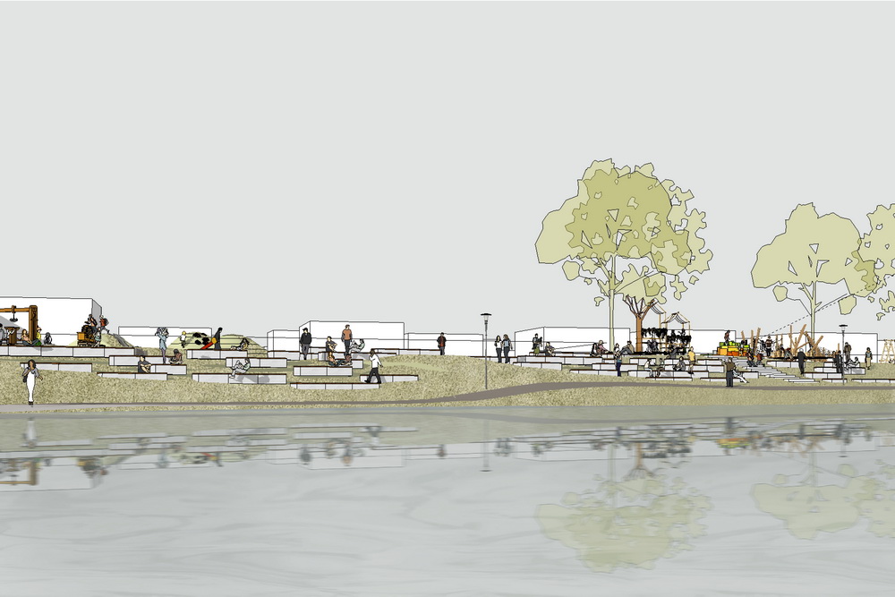 В дизайн-проекте предусмотрели трибуны-лежаки, навесы от солнца, качели, игровую площадку, зону воркаута, место для кострищ и кафе. Вдоль берега протянется велодорожка. Для уличных выступлений построят «балкон» — импровизированную сцену с природным «задником». Проектировщики запланировали три основные входные группы, со стороны улицы Новоморской оборудуют парковки.