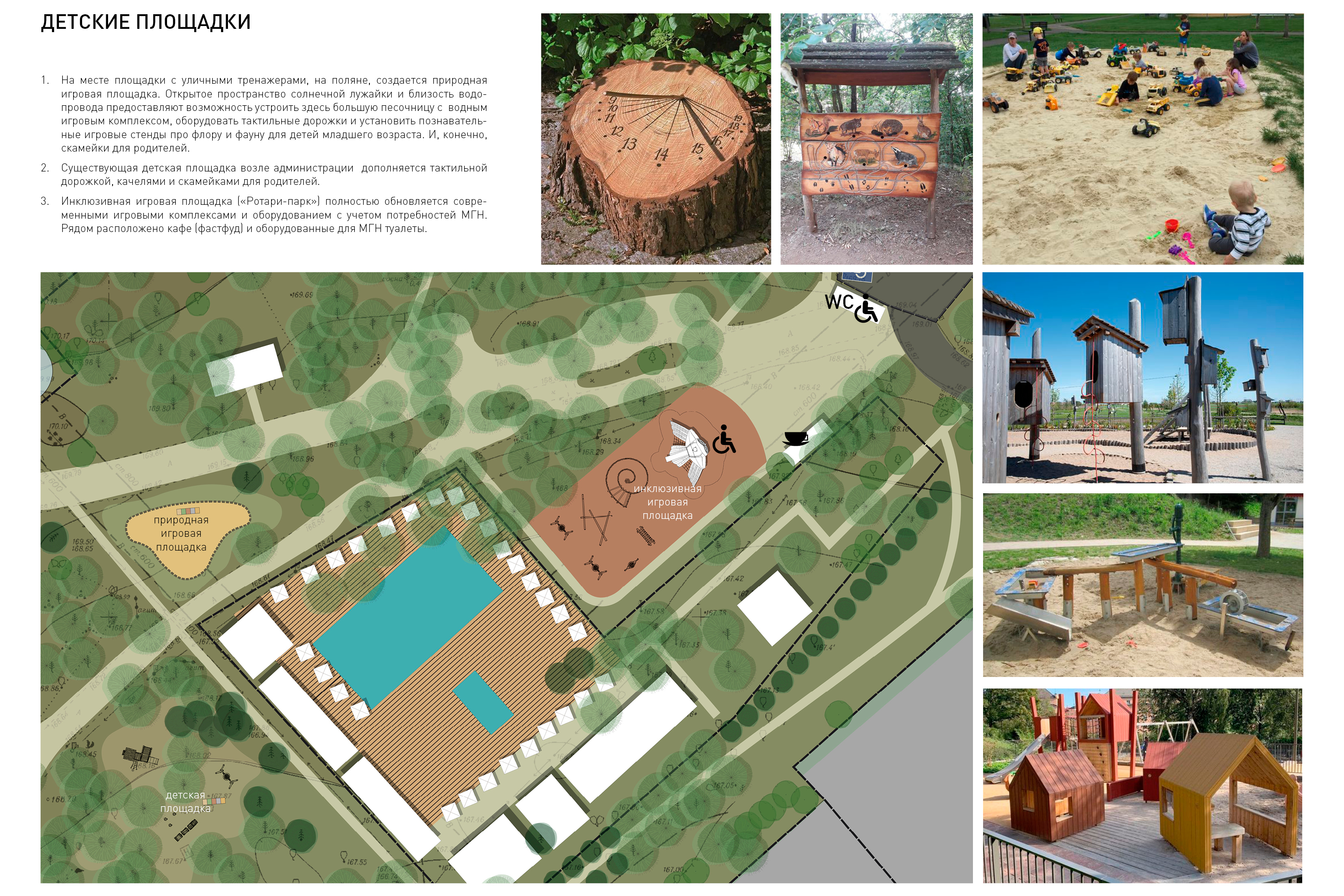 Перепад рельефа позволит создать террасы, горки, скалодромы и смотровые площадки. Через реку перекинут мостки.