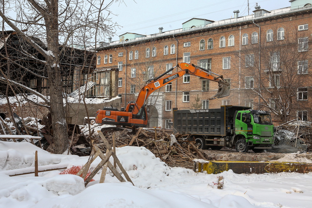 В то же время по соседству пустует здание, в котором располагались общежитие и отделение полиции. Четырёхэтажка сгорела прошлой зимой. Теперь местные жители опасаются, что застройщики захотят объединить два участка и возвести целый комплекс высоток.