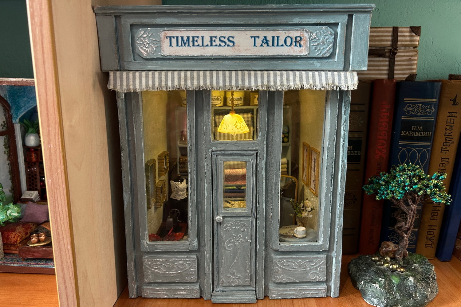 «Винтажный швейный магазин — одна из моих самых любимых работ. Я несколько раз переделывала крышку, витрину. Внутри — швейная машинка, манекен, на полках — ассортимент магазина. Пол сделан из палочек от мороженого. Освещение в основном из гирлянды на батарейках. Потолок делала с помощью трафарета и декоративной штукатурки», — рассказывает мастерица.