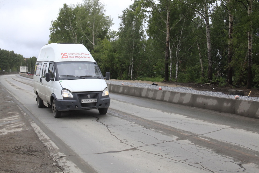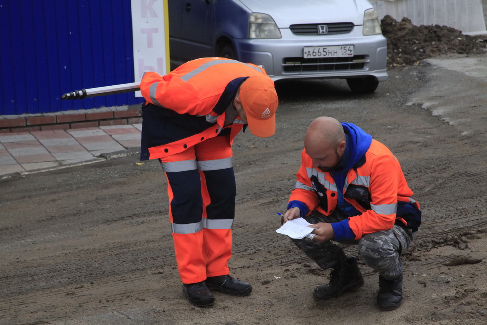 Дорога — как шахматная доска: такими участками и ведут ремонт. Со стороны «Мельницы» другая бригада движется навстречу. Там пока только убрали старое покрытие. Все два километра от перекрёстка с улицей Охотской до Мочищенского шоссе собираются реконструировать до октября следующего года.