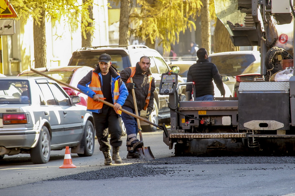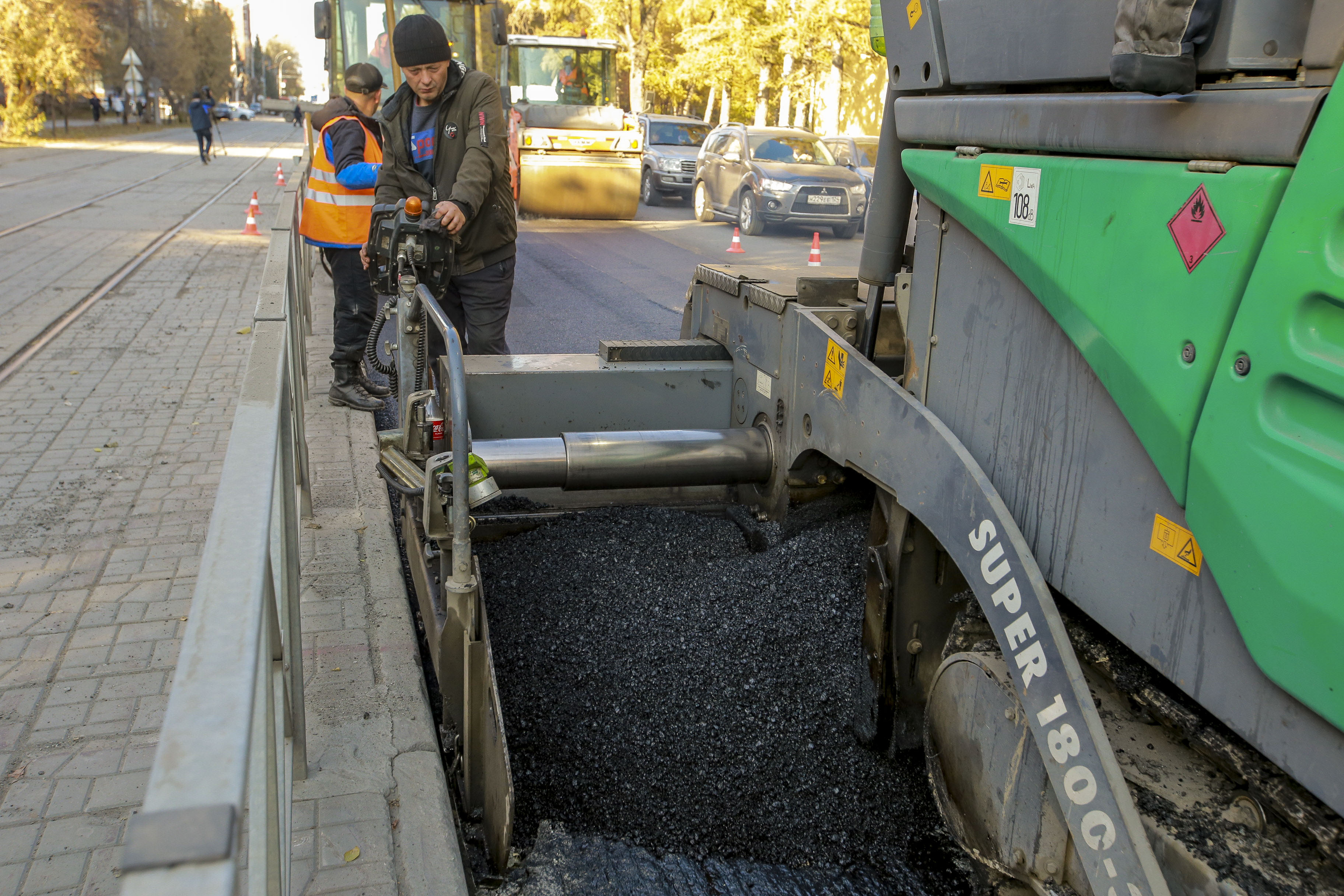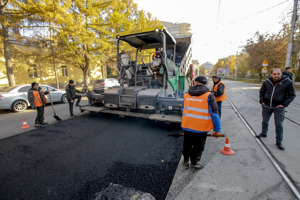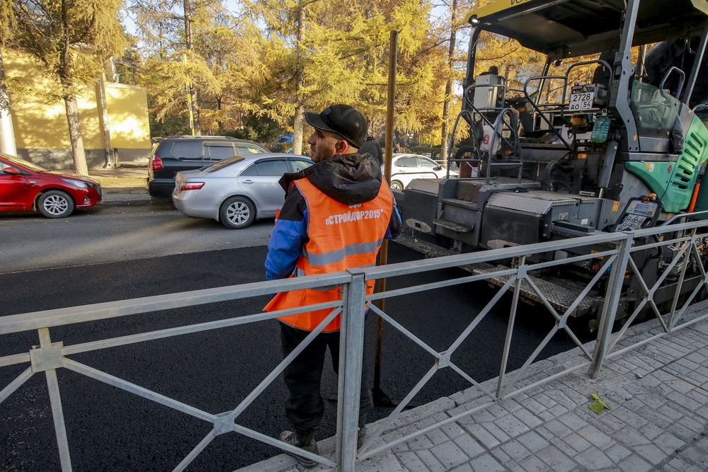 «Объём работ — практически 8500 „квадратов“: фрезерование старого полотна, укладка нижнего выравнивающего слоя, укладка битумно-минеральной смеси (три сантиметра). Работы начались здесь 11 числа, но потом мы на три дня прервались из-за этих тепловых сетей, потому что не знали, какой участок будет вскрываться», — объясняет коммерческий директор подрядной организации Вахид Заманов.