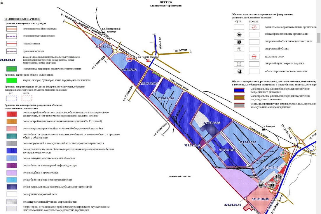 Во-вторых, улицу Дукача продлят до Толмачёвского сельсовета сквозь промышленную зону, перекинув путепровод через железнодорожную линию. Улицу Титова доведут до границы Новосибирска, а в месте пересечения с ж/д веткой построят путепровод для автомобилей, трамвая и пешеходов. Схема проекта планировки показывает, что в этой же локации появится остановочный пункт городской электрички Чистая слобода.