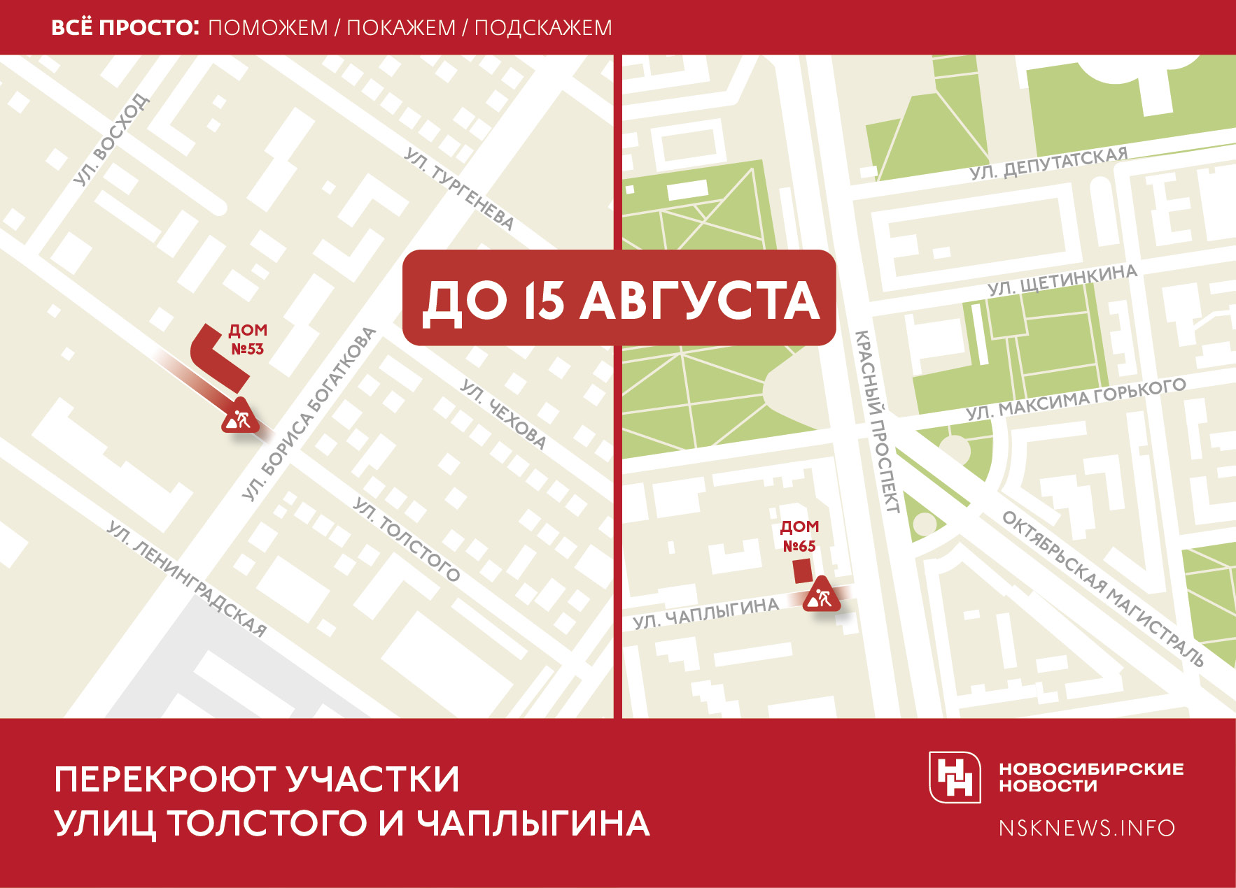 Так, в Октябрьском районе Новосибирска до 15 августа закрывают проезд по улице Толстого напротив СибГУТИ — на участке от дома №53 на Бориса Богаткова до перекрёстка с Бориса Богаткова.