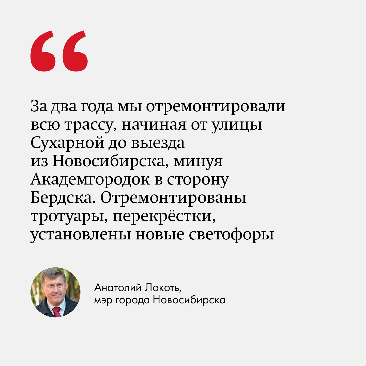 «За два года программы БКАД мы отремонтировали всю эту трассу, начиная с улицы Сухарной и до выезда из Новосибирска. А это больше 30 километров трассы», — отмечает мэр города Анатолий Локоть.