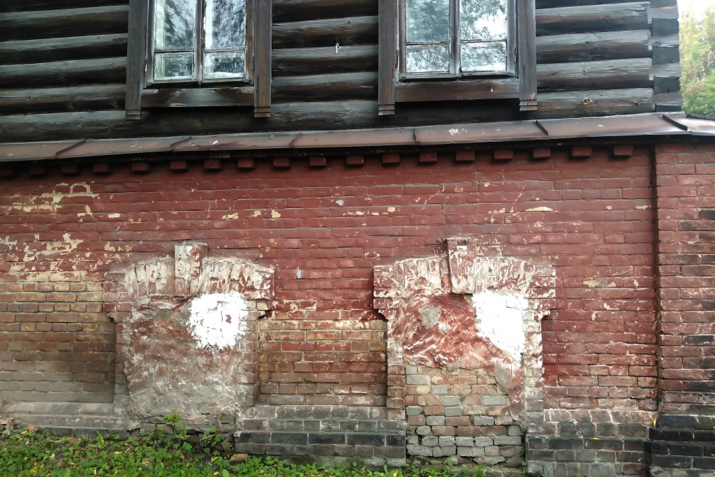Мы, кстати, застали её за подметанием двора. Женщина добавила, что дом планируют расселить и снести, хотя ей очень жаль будет с ним расставаться. Она уверена, что он ещё сто лет простоит, ведь за 110 лет службы даже не накренился. Выглядит дом очень необычно. Загадочности добавляют заложенные кирпичом окна в половине цокольного этажа. Его вторая половина жилая.