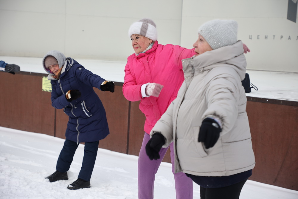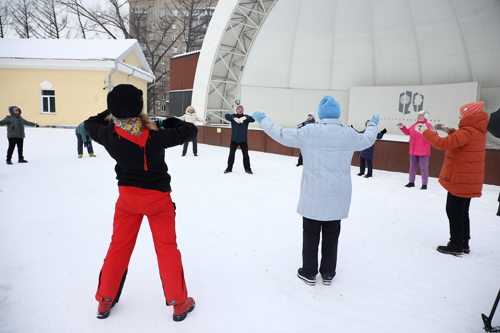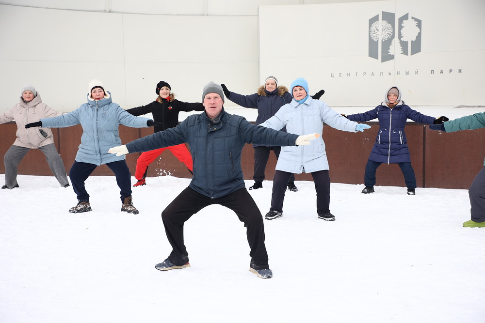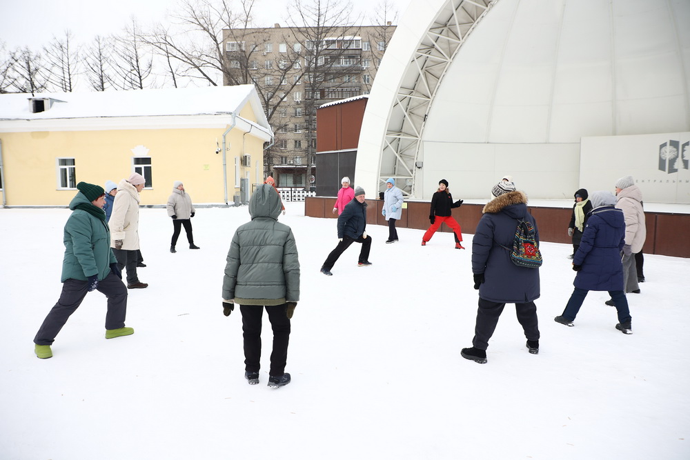 Эта зима выдалась не самой тёплой: чаще всего столбики термометров опускались до −20...-25 градусов. Но морозы почти не помешали тем, кто каждую среду собирался на гимнастику под открытым небом.