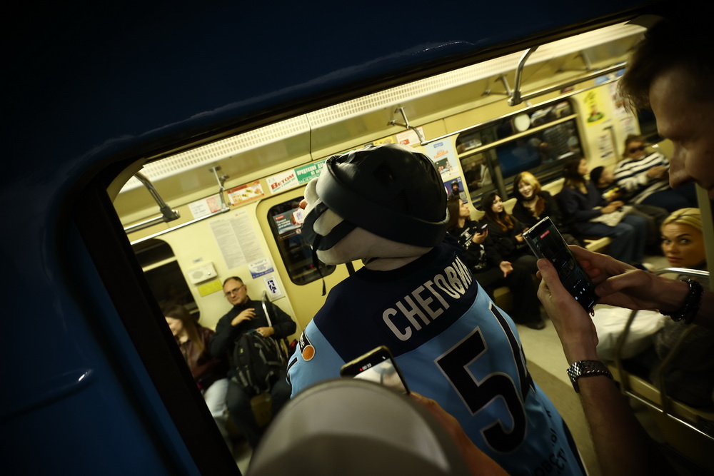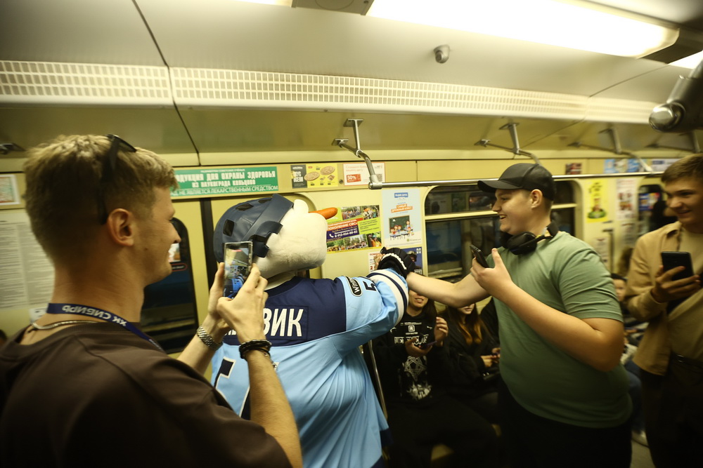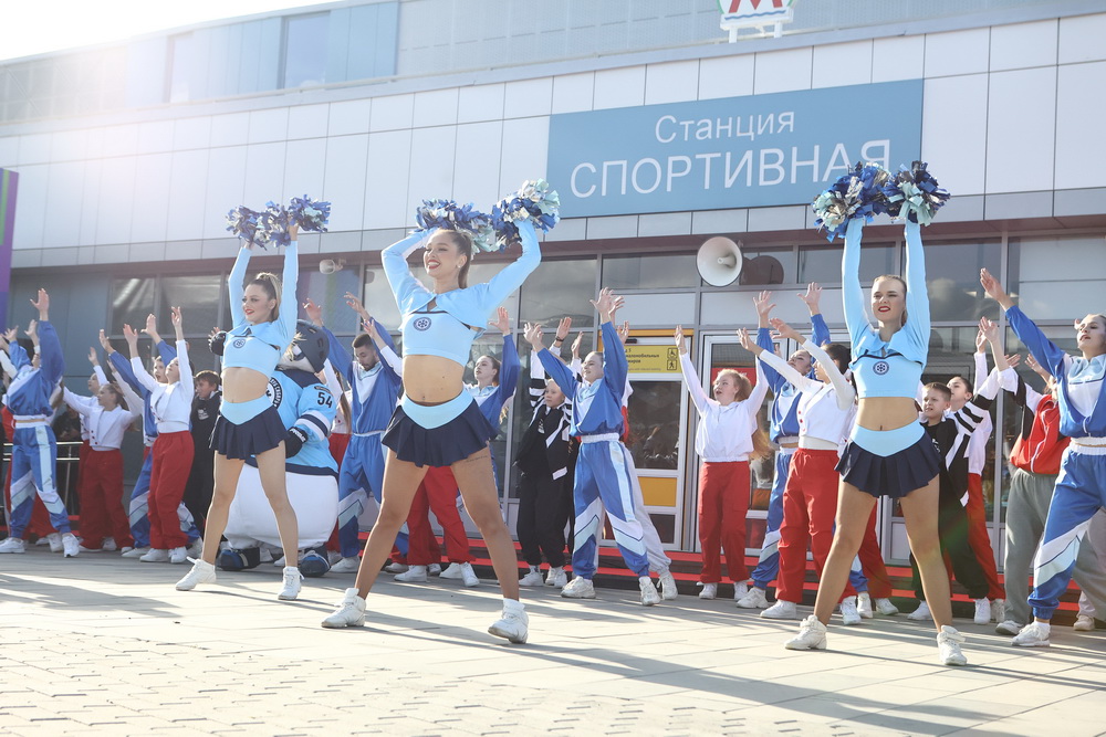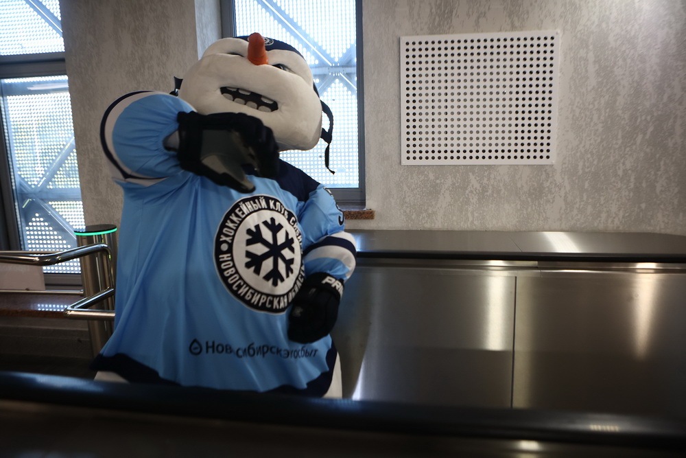 Сотни пассажиров ждали открытия станции на улице. Чтобы они не скучали, зажигательными танцами их развлекали Злобный Снеговик и чир-лидерши ХК «Сибирь».