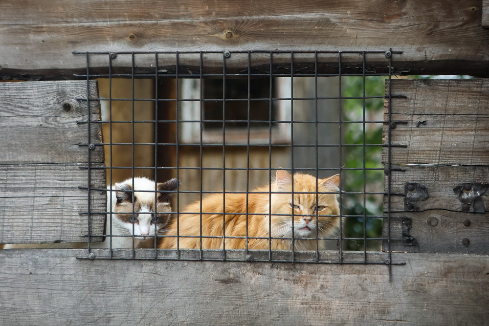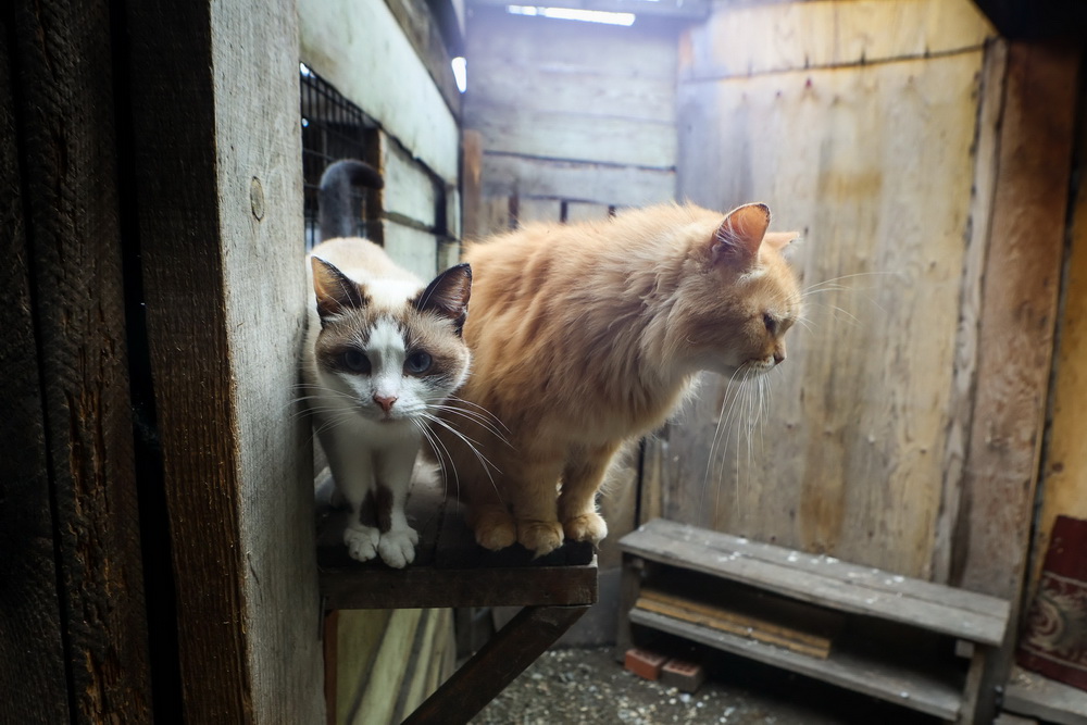 В соседнем вольере, тоже с кошками, живёт старая собака, которая из-за сломанной психики делает вид, что её нет, панически всех боится. Конуру занимают кошки. Среди них кот, который пугается людей.