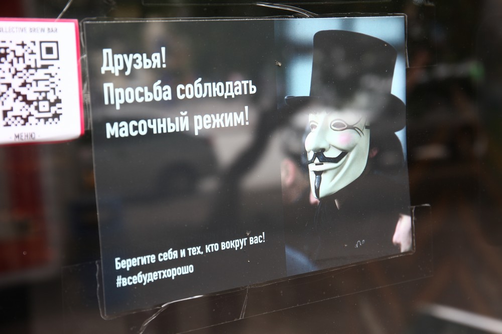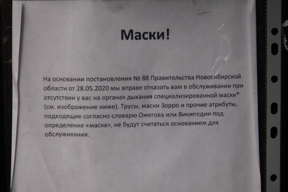 В другом кафе, работающем навынос, вывешено объявление с предупреждением о масочном режиме: «При отсутствии на органах дыхания специализированной маски мы вправе отказать вам в обслуживании. Трусы, маски Зорро и прочие атрибуты, подходящие согласно словарю Ожегова и Википедии под определение „маска“, не будут считаться основанием для обслуживания».