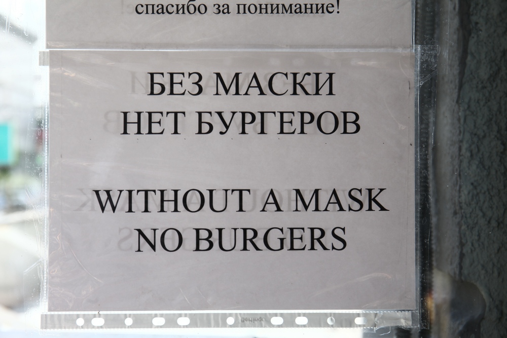 Шуточное объявление в бургерной при должной интонации можно прочесть как угрозу: «Без маски нет бургеров». Но если включить чувство юмора и прислушаться к требующему свежих котлет желудку, то руки сами потянутся за маской.