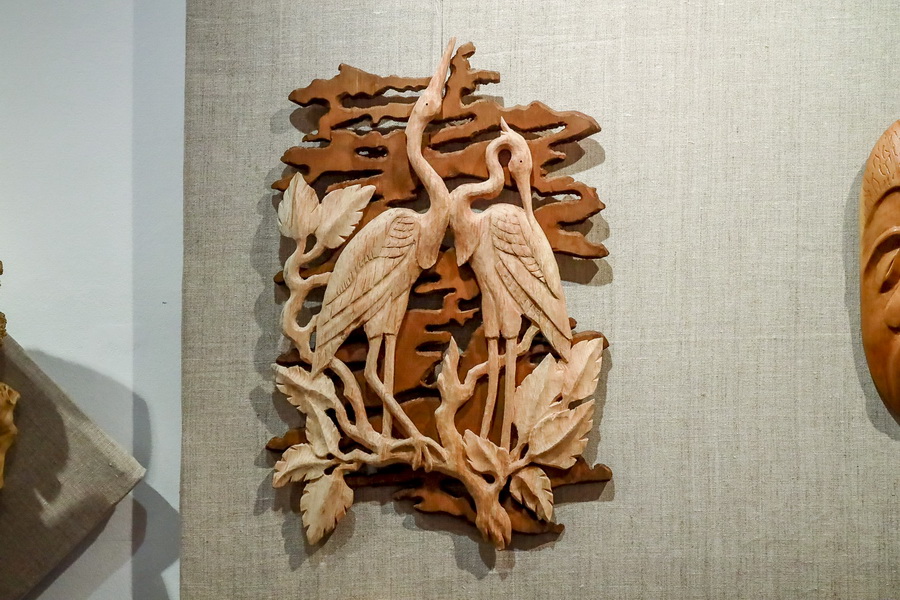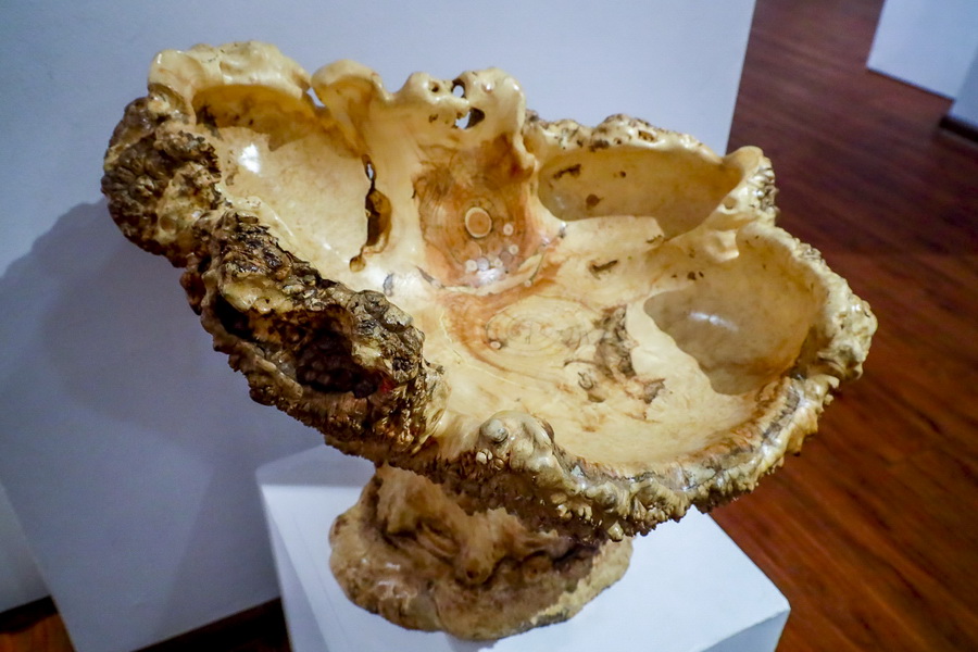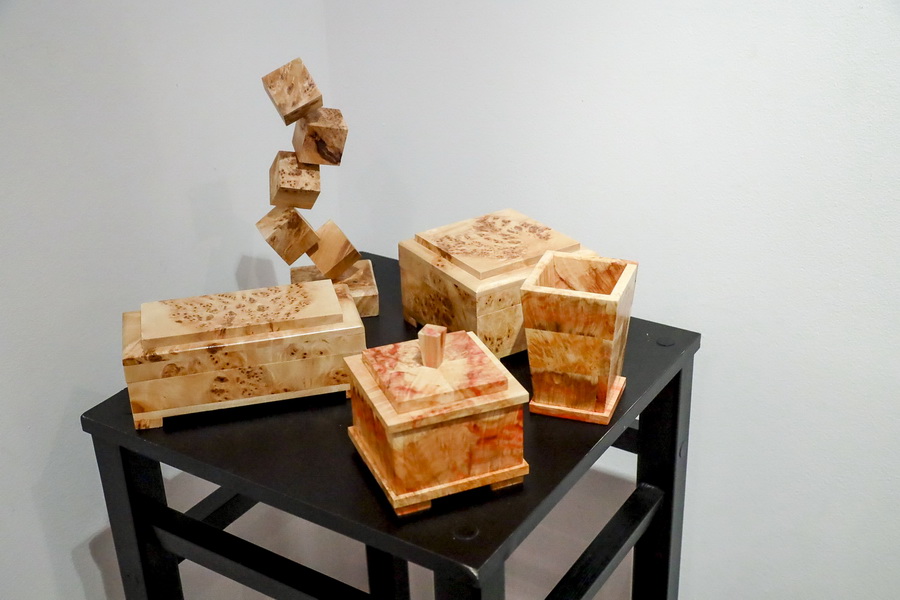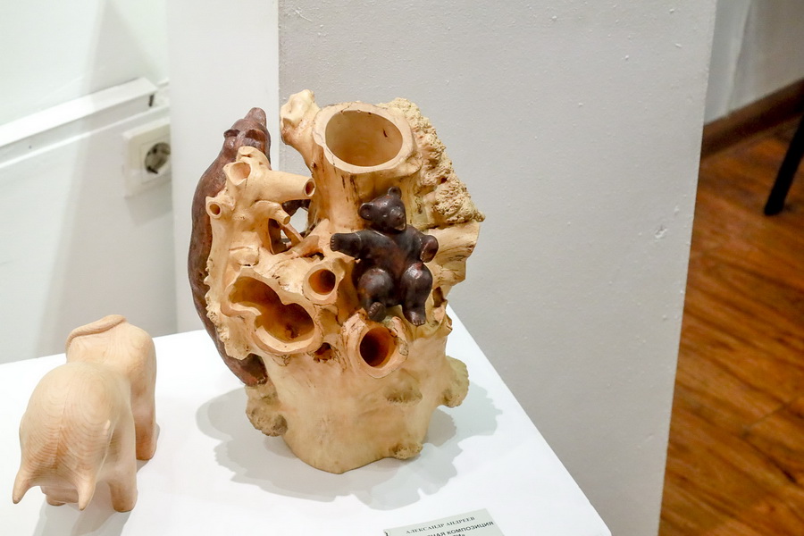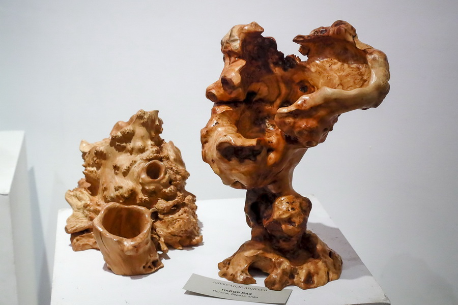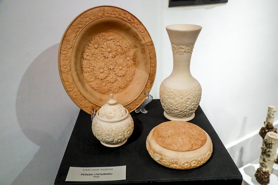 Особое внимание привлекают скульптуры, шкатулки и тарелки, на которых кропотливо и с геометрической точностью выскоблены миниатюрные рисунки. Каждый экспонат пропитан глубиной, мудростью и опытом, полученным за долгие годы работы у станка.