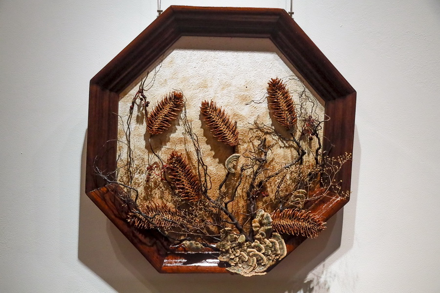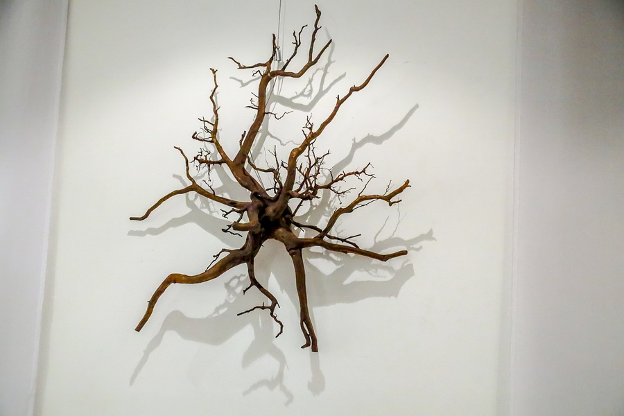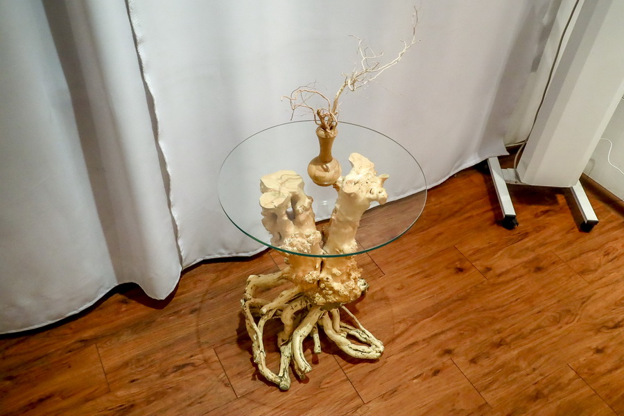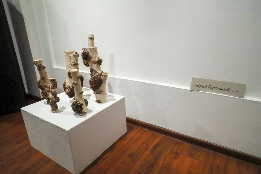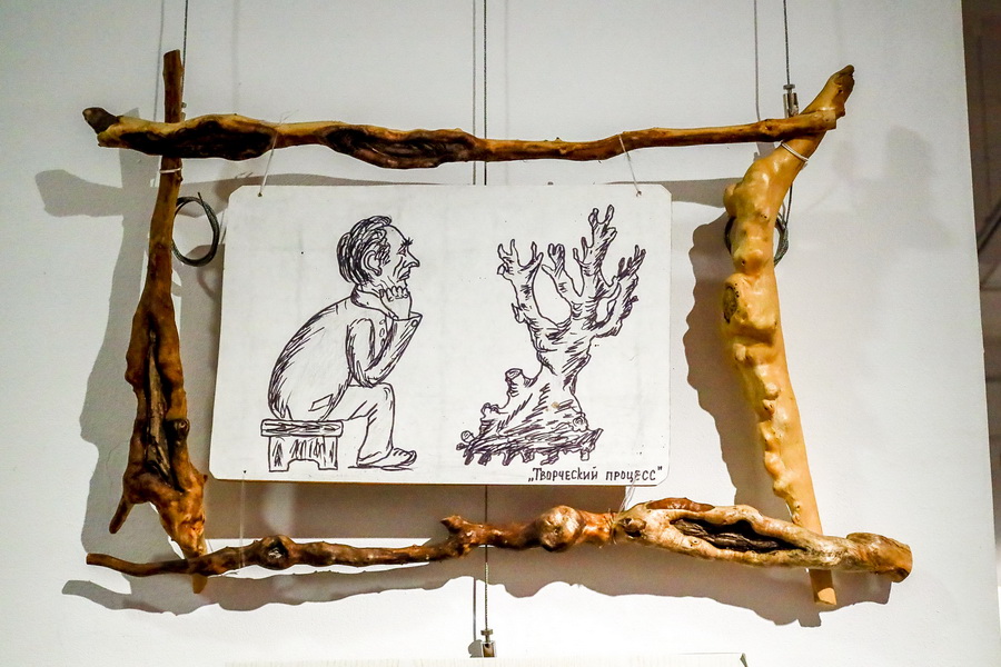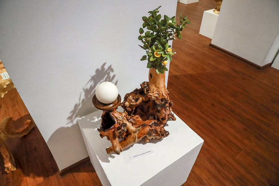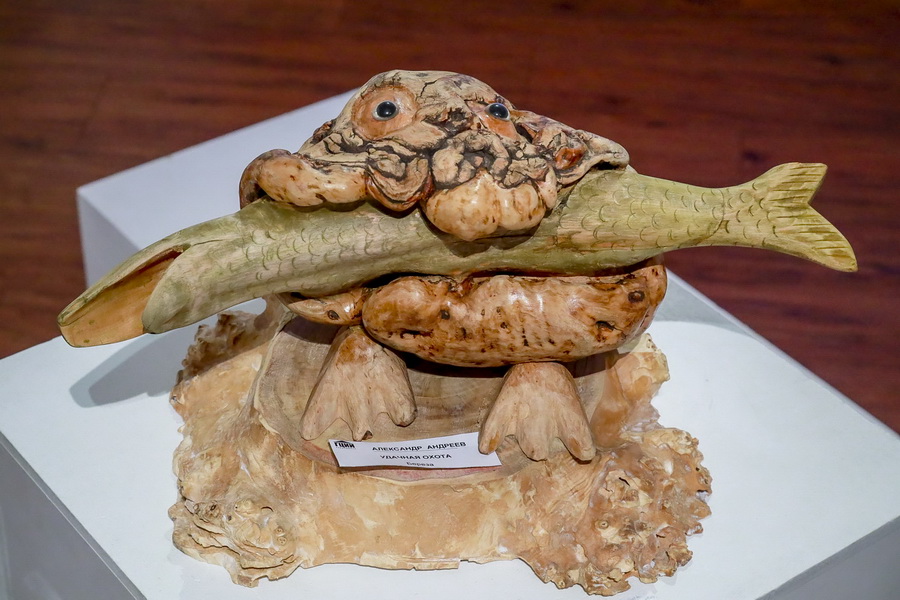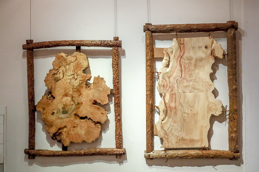 Экспозиция демонстрирует, насколько пластичной, самобытной и живой может быть древесина: мастер будто отливает изделия, а не вытачивает их на станке. Часть произведений выполнена в технике корнепластики. Напольная подставка под цветы с отделением для свечи, статуэтка «Удачная охота» в виде жабы, схватившей рыбу, вазы разных размеров, шкатулки, мебель — всё это сохранило первозданную структуру дерева, но имеет самодостаточный, законченный вид.