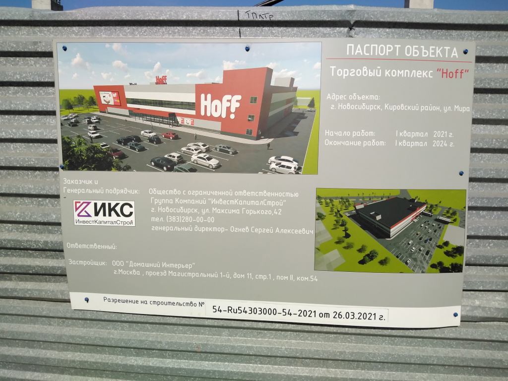 О будущем строительстве магазина «Новосибирским новостям» в феврале сообщали в московской компании «Домашний интерьер». Она развивает единственную российскую и крупнейшую в стране сеть гипермаркетов мебели и товаров для дома Hoff, основанную бывшими топ-менеджерами «М.Видео» Михаилом Кучментом и Александром Зайонцем в 2009 году.