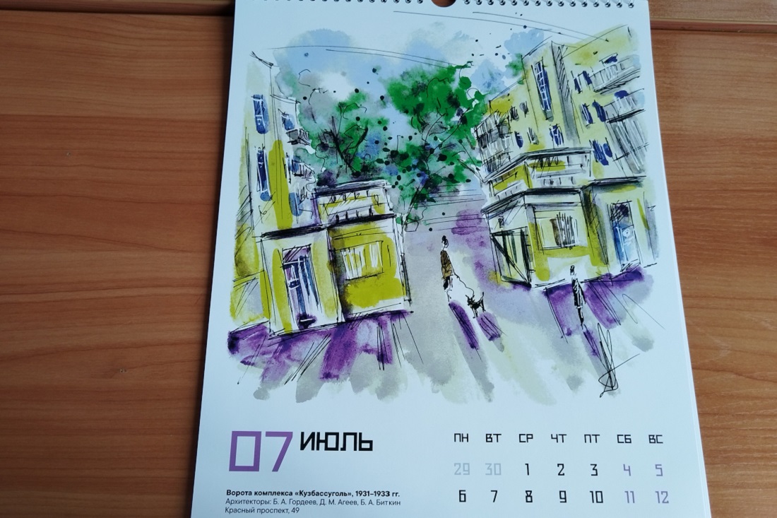 На страницах календаря мы видим здание аэроклуба, кинотеатр «Металлист», ворота комплекса «Кузбассуголь», краевую больницу, химический колледж, электроподстанцию, спорткомплекс «Динамо», Дом с часами и другие исторические здания.