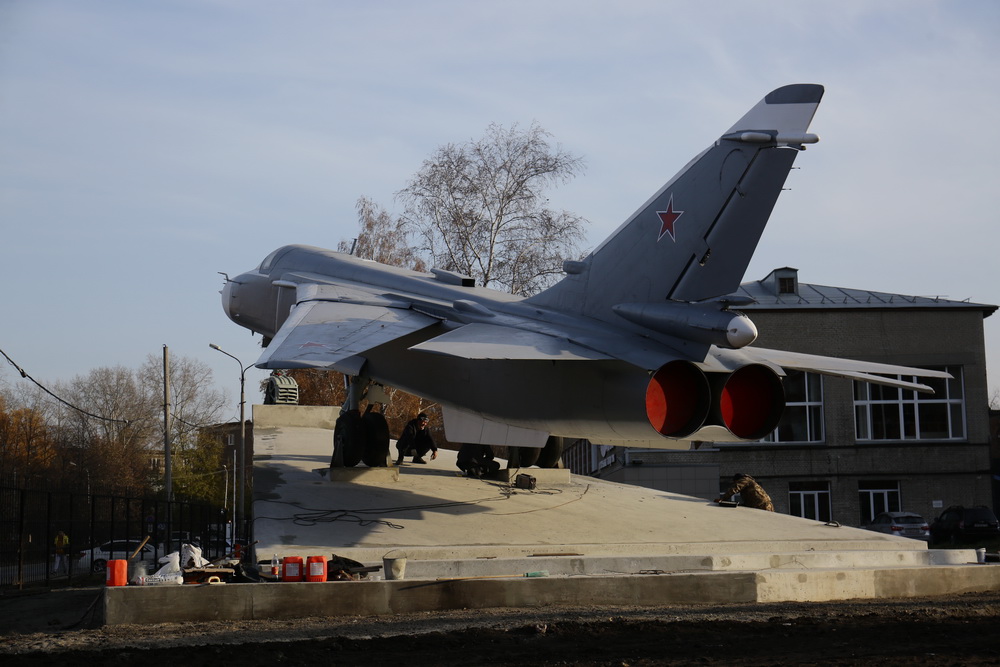 Ночью 19 октября военный бомбардировщик Су-24 на специальном трейлере проехал через весь Новосибирск. Маршрут лежал от завода Чкалова до сквера НГТУ. Сегодня, 21 октября, рабочие завершили установку 20-тонного самолёта на подготовленное специально для него возвышение.