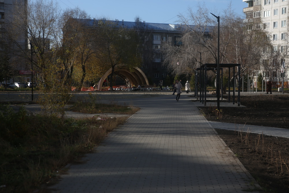 По оценке подрядчика, сквер готов уже на 95%. Сделали дорожки, установили лавочки, подключили освещение. В дальнейшем появится сцена. Её как раз сейчас монтируют. В последнюю очередь установят детские площадки.