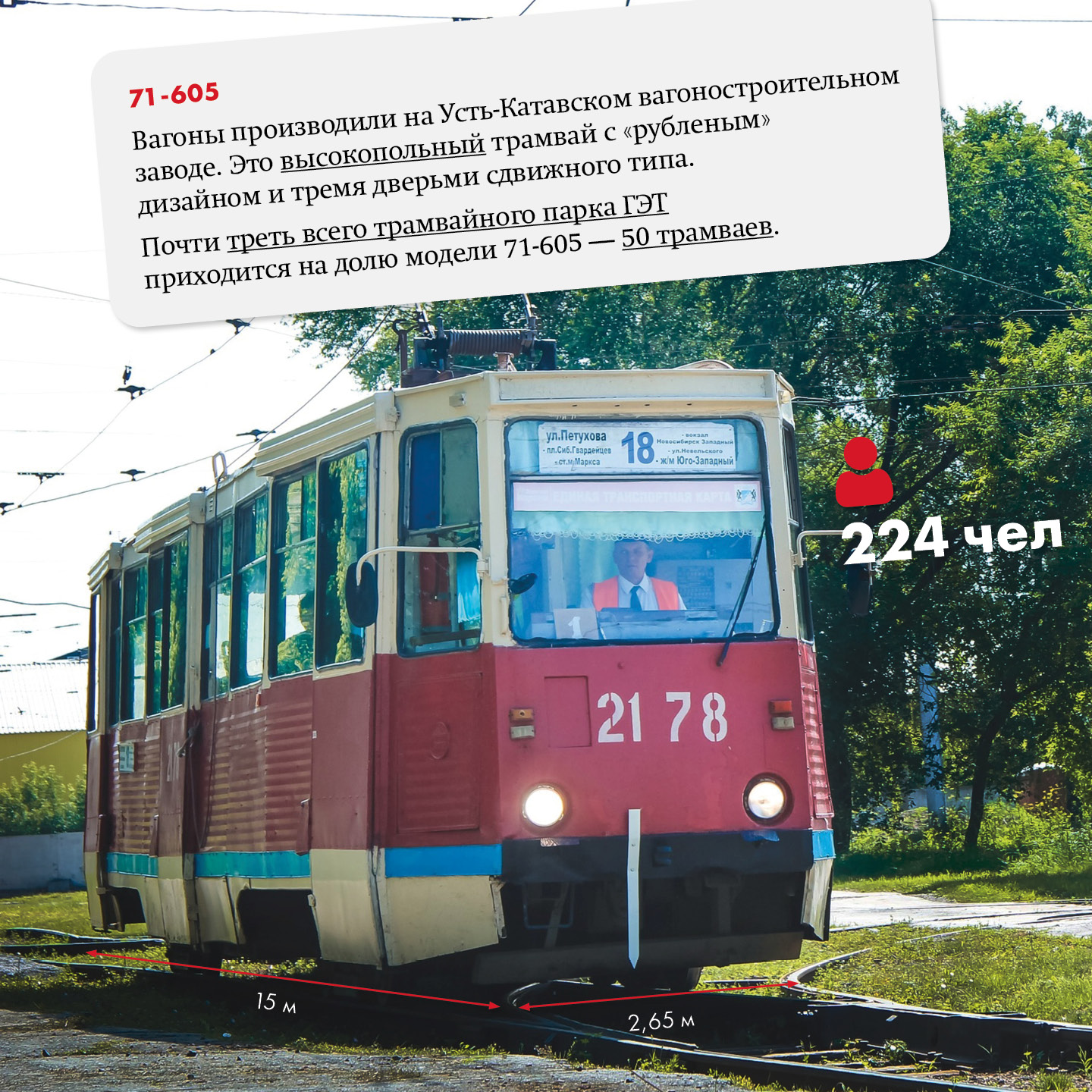 Королями новосибирских трамвайных рельсов по праву можно считать вагоны, выпущенные Усть-Катавским вагоностроительным заводом. В городе 112 таких трамваев. Почти треть всего трамвайного парка ГЭТ приходится на долю модели 71-605.
