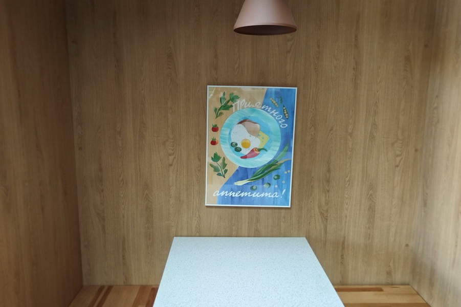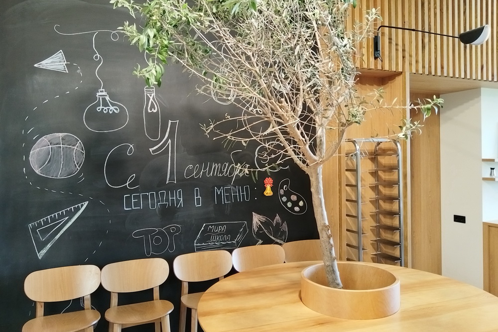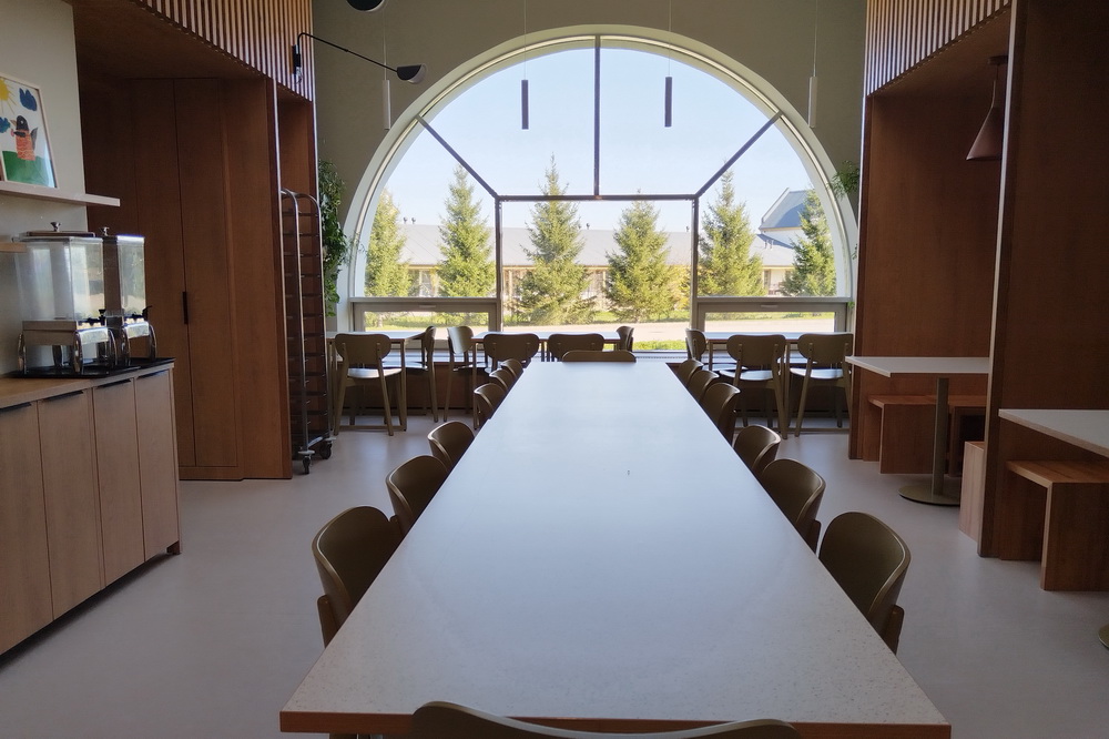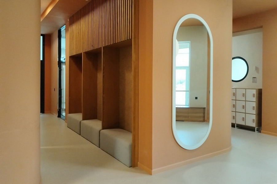 В коридорах и холлах оборудовано множество приватных ниш и диванчиков для отдыха, общения и занятий. Столовую оформили в формате кафе с отдельными столиками в отсеках. Пол застелили экологичным покрытием из льняного масла и жмыха. Острых углов вы здесь не найдёте — все переходы плавные и безопасные.