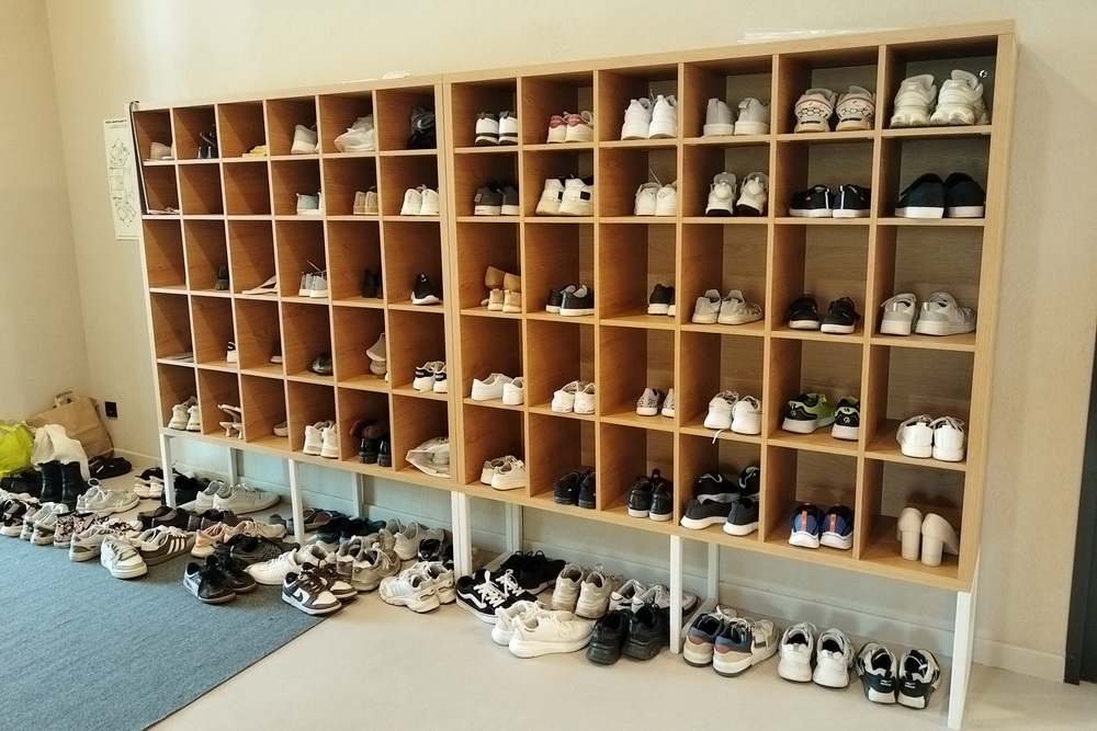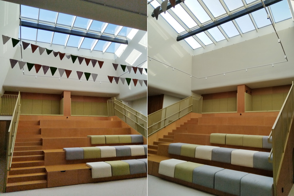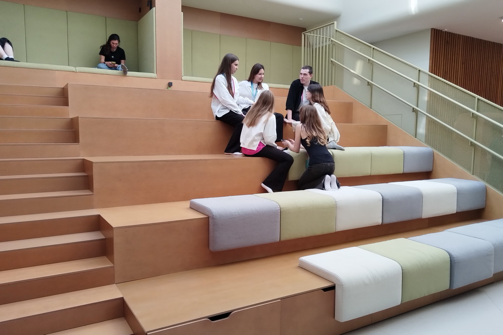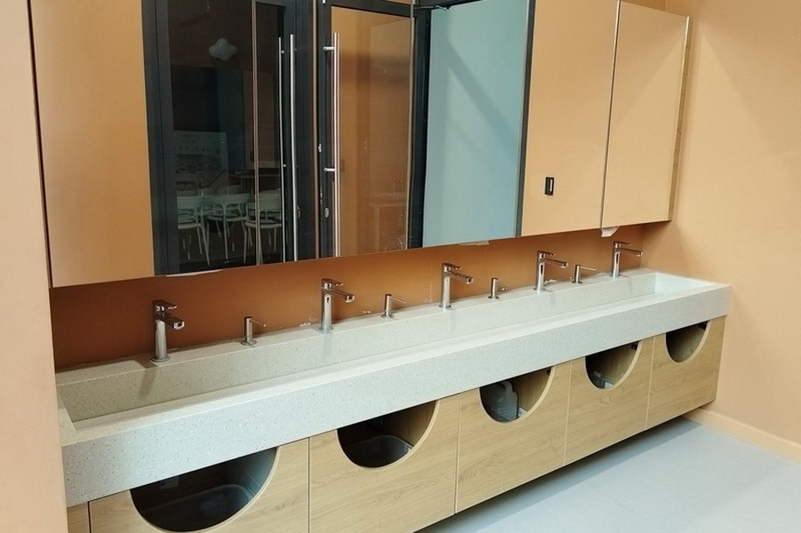 Школьники постарше в новом здании начали отвоёвывать себе приватные пространства, чтобы посекретничать. Специально для этого в одном из туалетов для девочек установили скамью, где можно спокойно посидеть и обсудить важные темы.