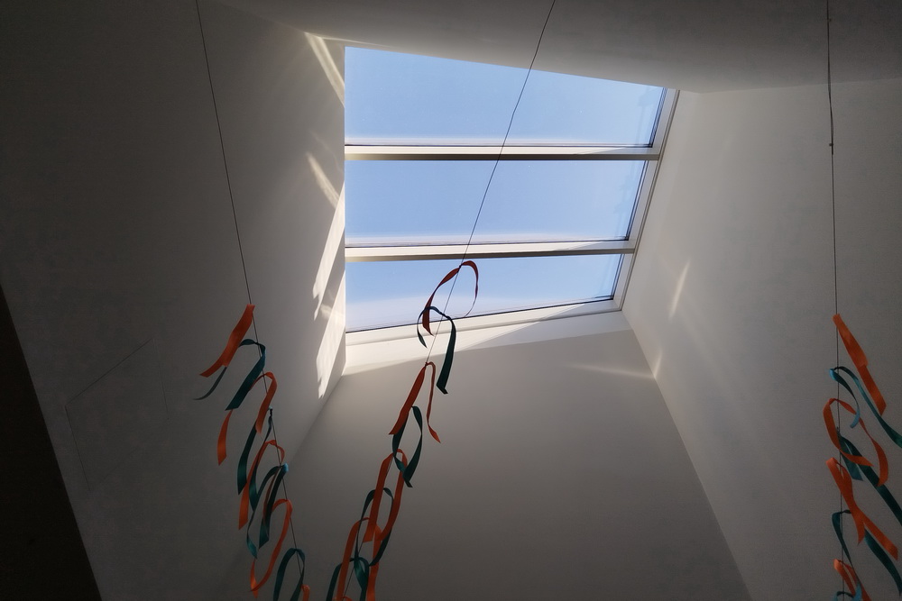 В кровле оборудованы несколько «фонарей»: самый большой из них освещает центральный зал с трибунами, а в классах потолочные окна чуть меньше по площади. Панорамные виды из спортивного зала и кабинетов при необходимости можно закрыть блэкаут-шторами. Поскольку СНиПы запрещают в школах кондиционеры, дизайнеры предложили оборудовать вытесняющую вентиляцию. Свежий воздух подаётся снизу.