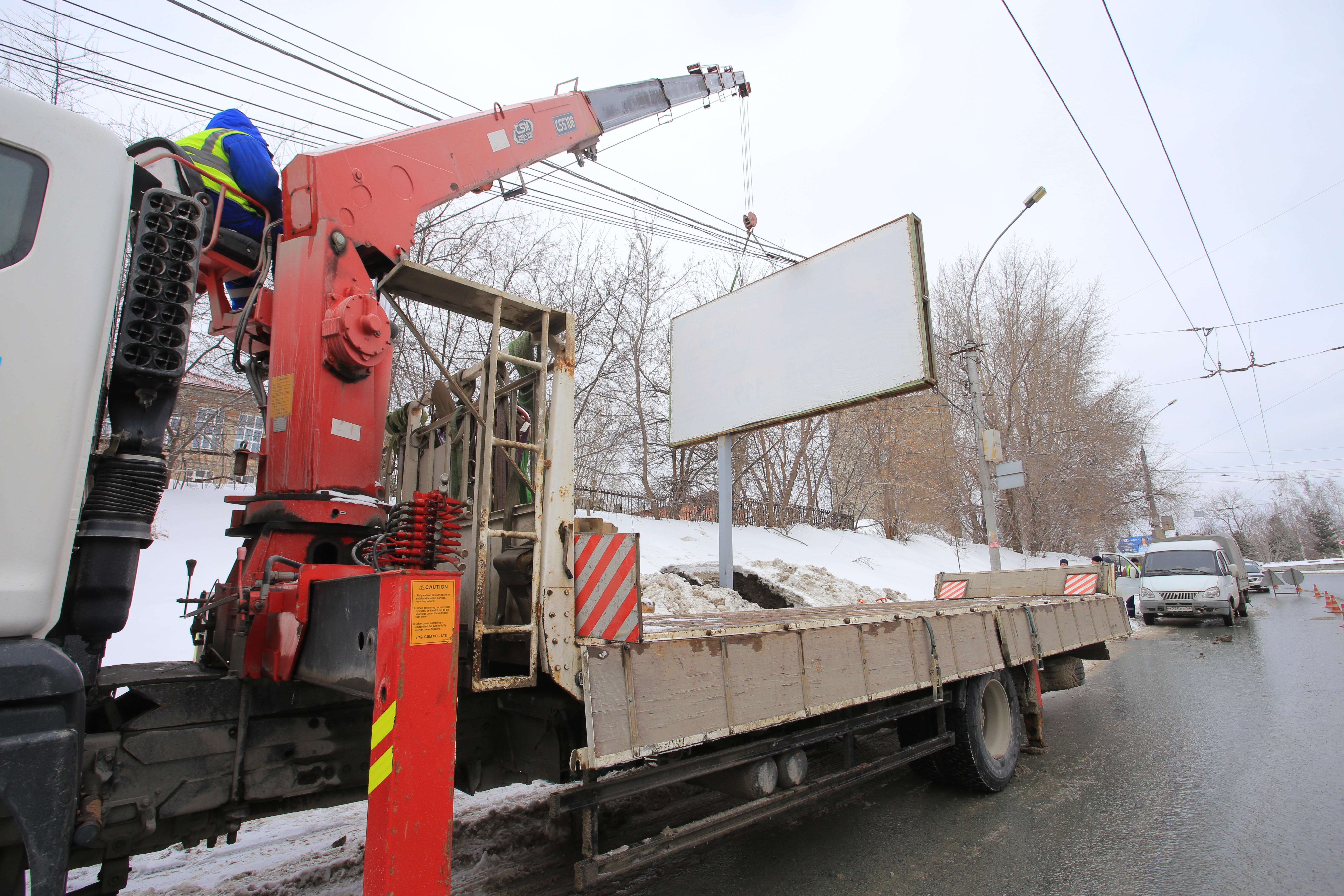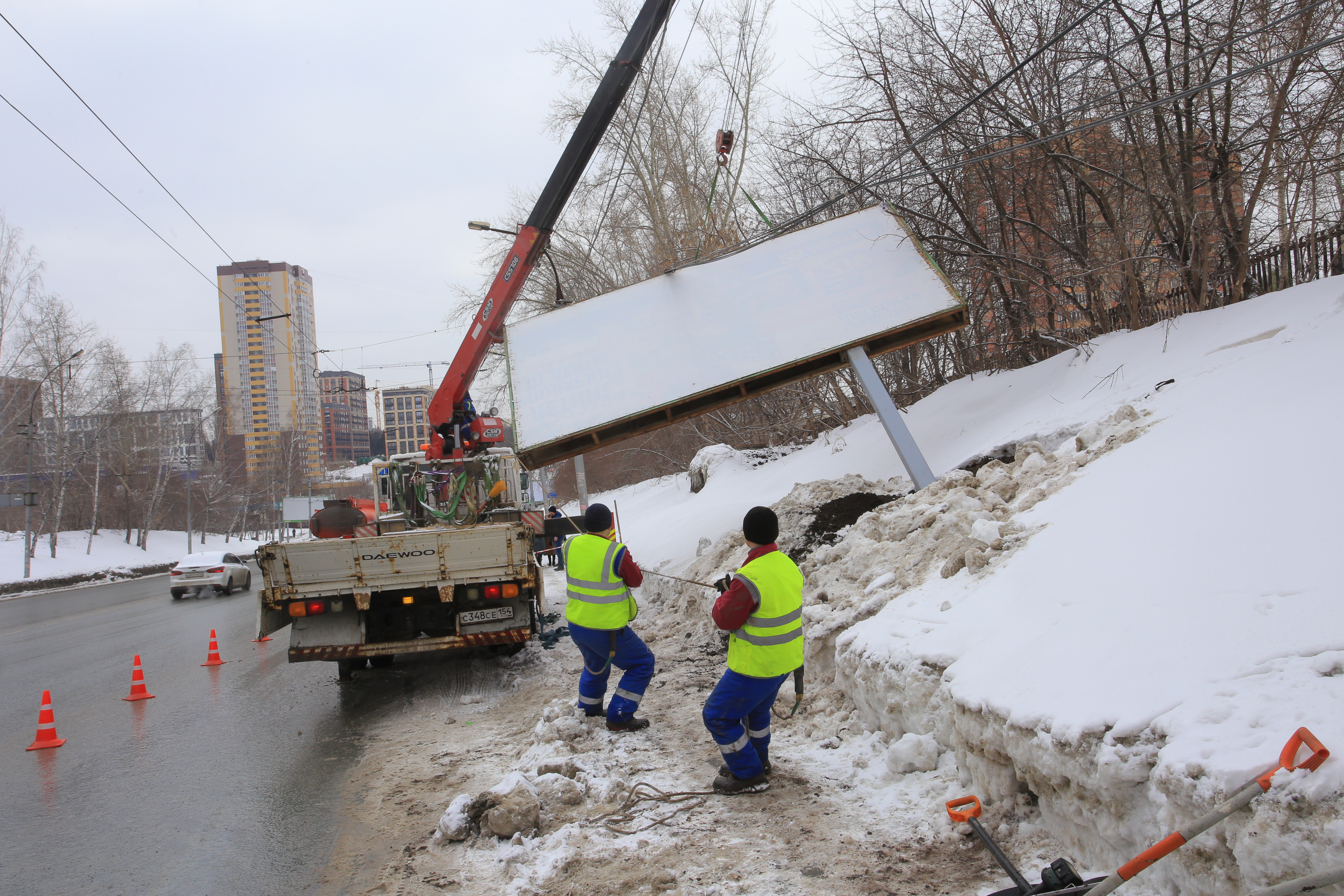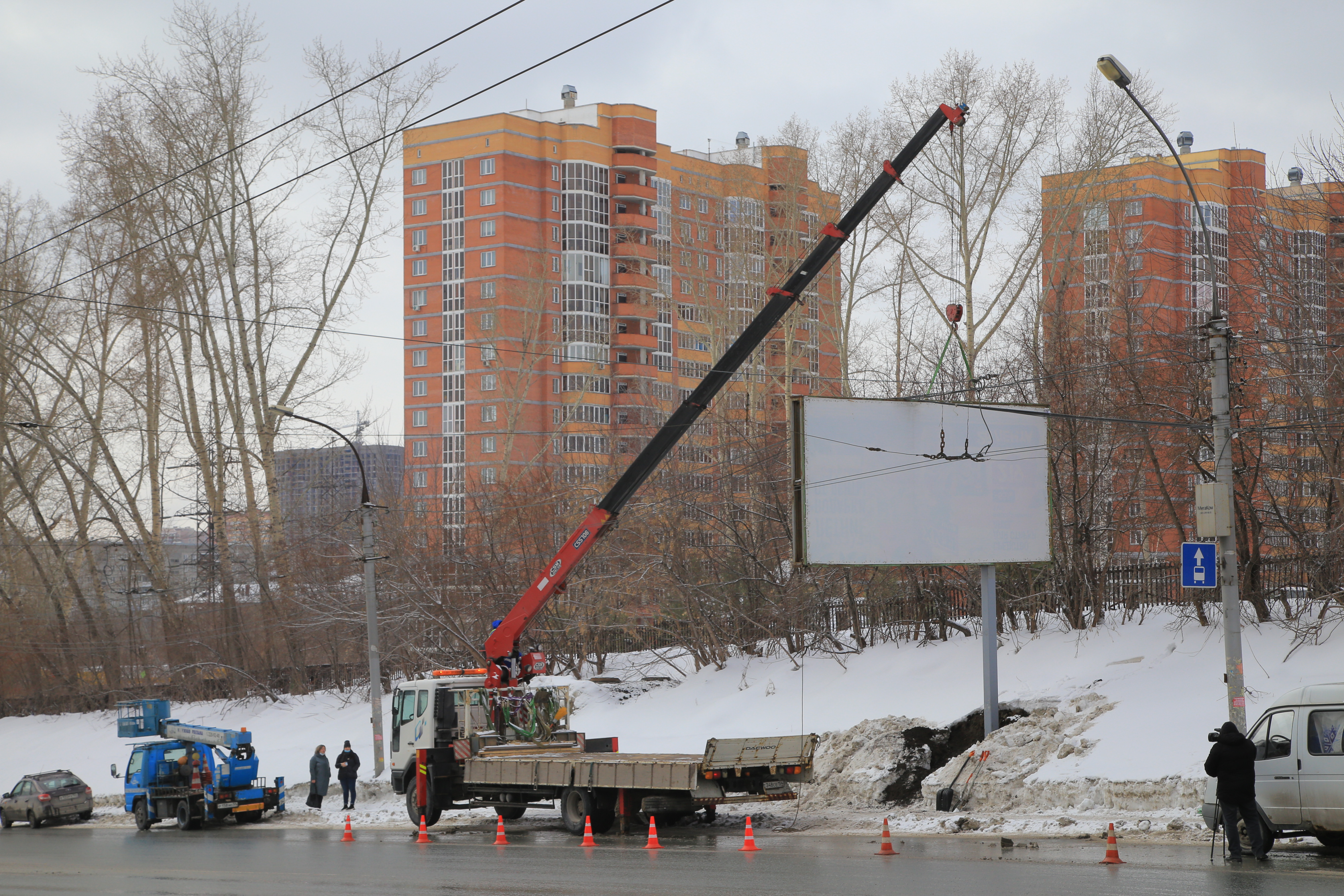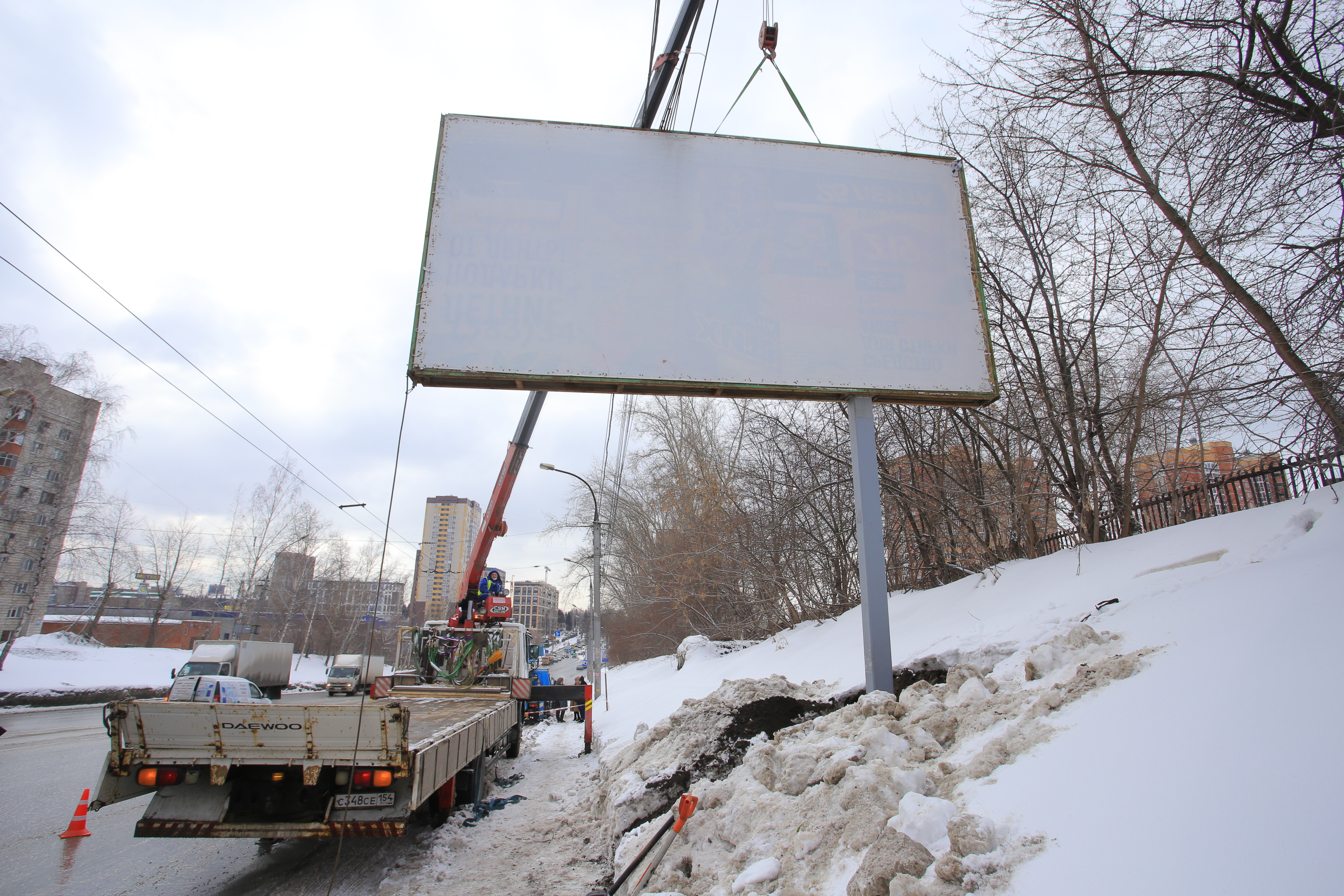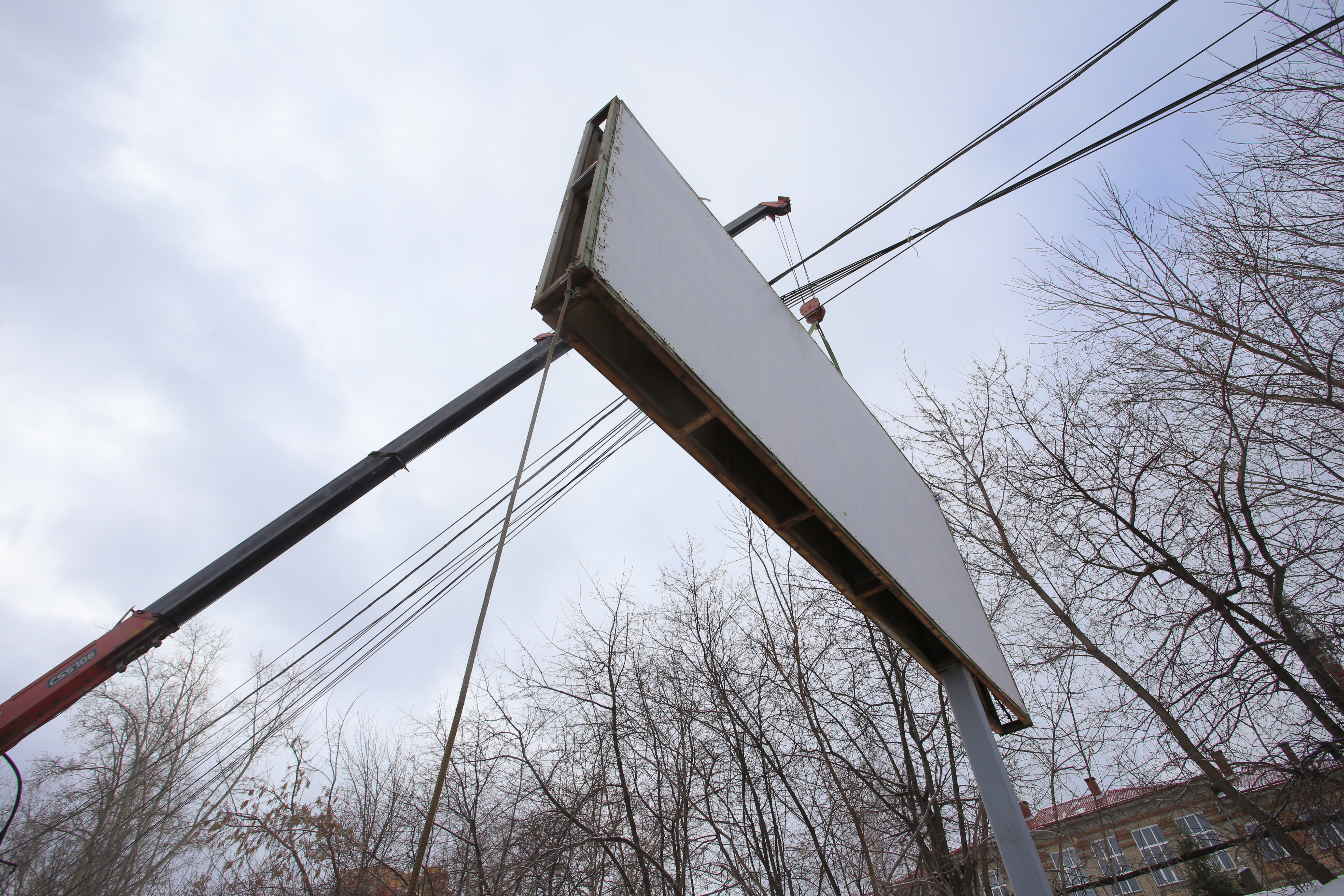 Рекламные операторы это понимают, и сокращение по 19 улицам сдвинулось на последний месяц по объективным причинам. У нас было важное выездное совещание. На улице Нарымской убрали два больших суперсайта. Эти гигантские утюги 5×15 разбирали всю ночь.