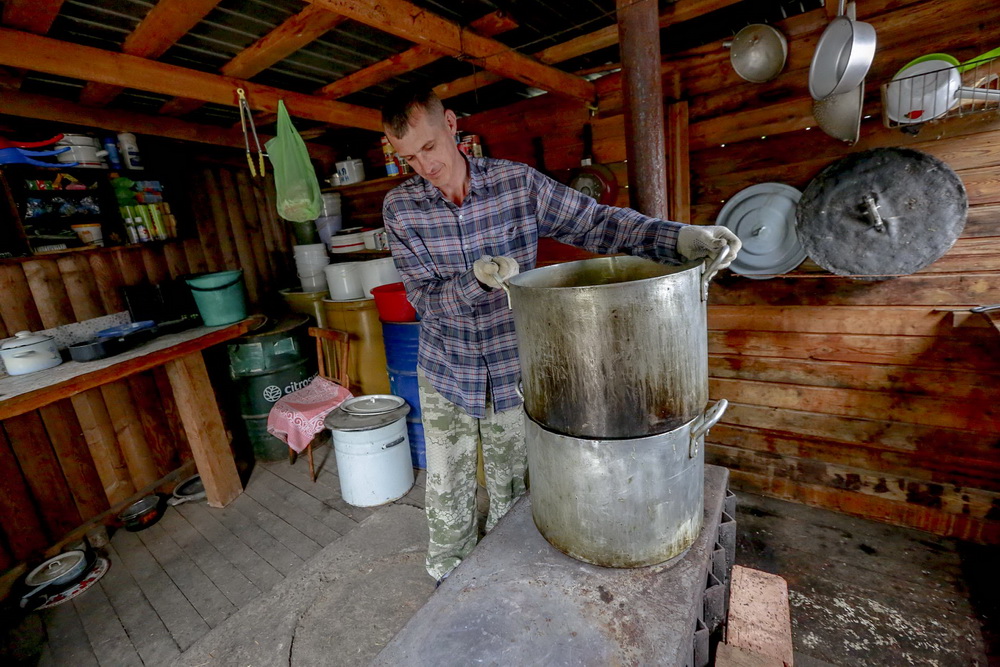 Летом животным насыпают сухой корм, и это немного упрощает жизнь Диме. Кстати, чтобы накормить всех собак, на день нужно 32 кг гранул. Когда наступают холода, работник ежедневно варит для постояльцев кашу. На территории он оборудовал специальную кухню с печкой, на которой помещаются два огромных бака.